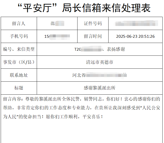 2025年6月23日,我局黎溪派出所收到“平安厅”局长信箱表扬信。