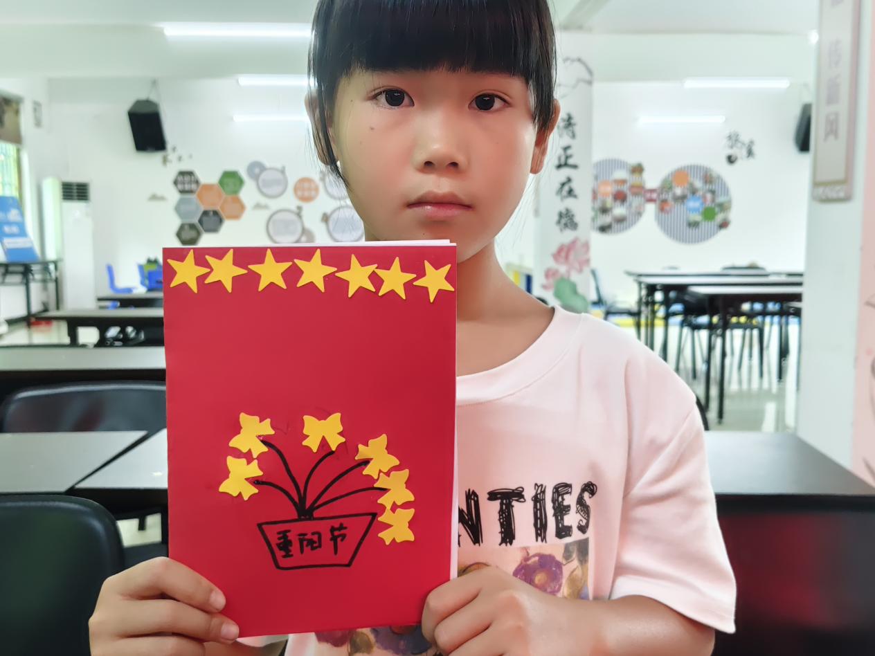 活动中,志愿者以生动有趣的语言向孩子们介绍了重阳节的起源、登高赏菊、佩茱萸等传统习俗,并结合“九九重阳”的谐音寓意,引导孩子们理解“久久长寿”的文化内涵。随后,在志愿者的示范下,孩子们发挥创意,用彩纸、黏土、贴画等材料制作节日贺卡。有的孩子画下与爷爷奶奶登高的场景,有的写下“祝爷爷奶奶健康长寿”的暖心话语,现场洋溢着温馨欢乐的氛围。