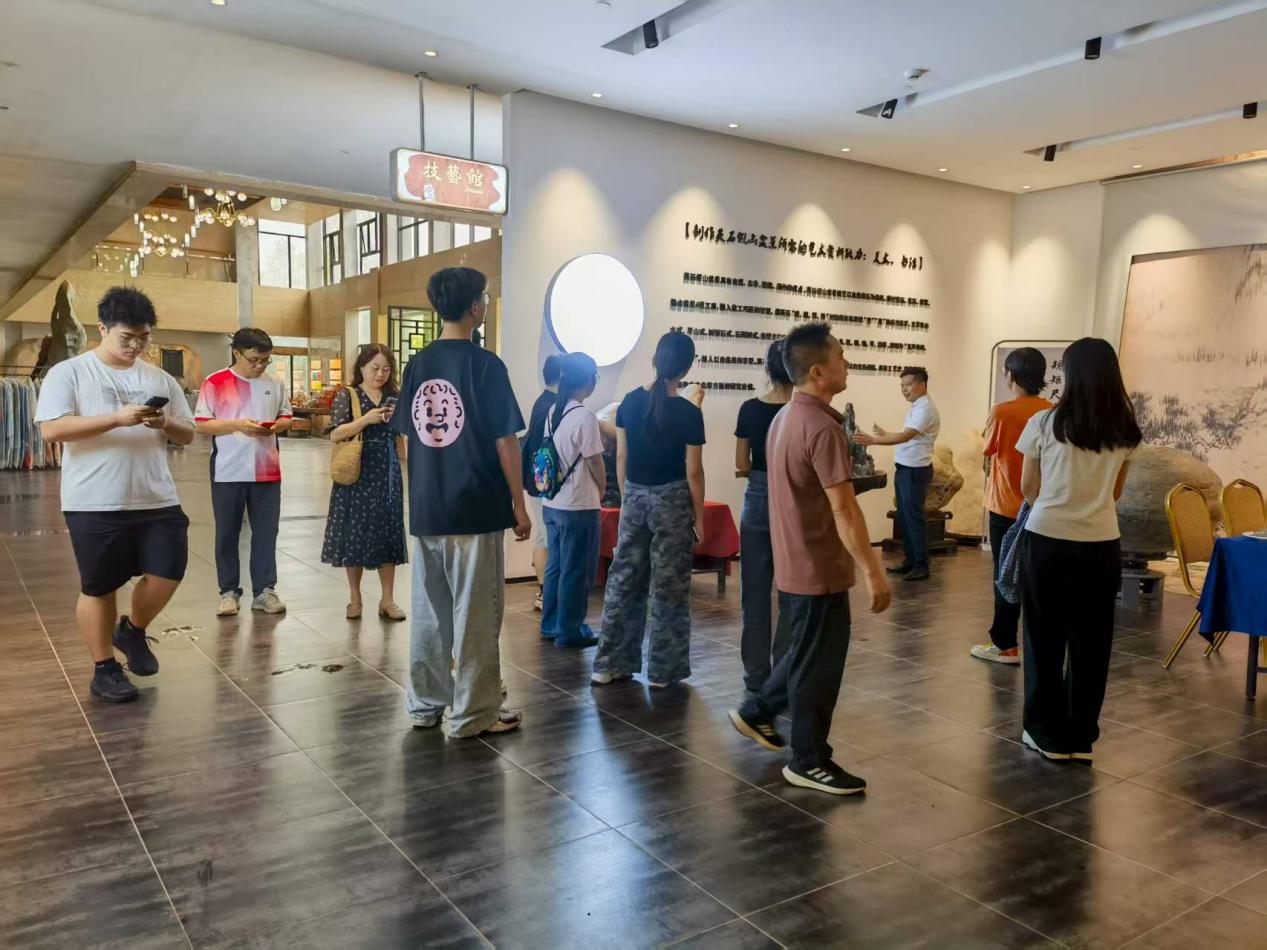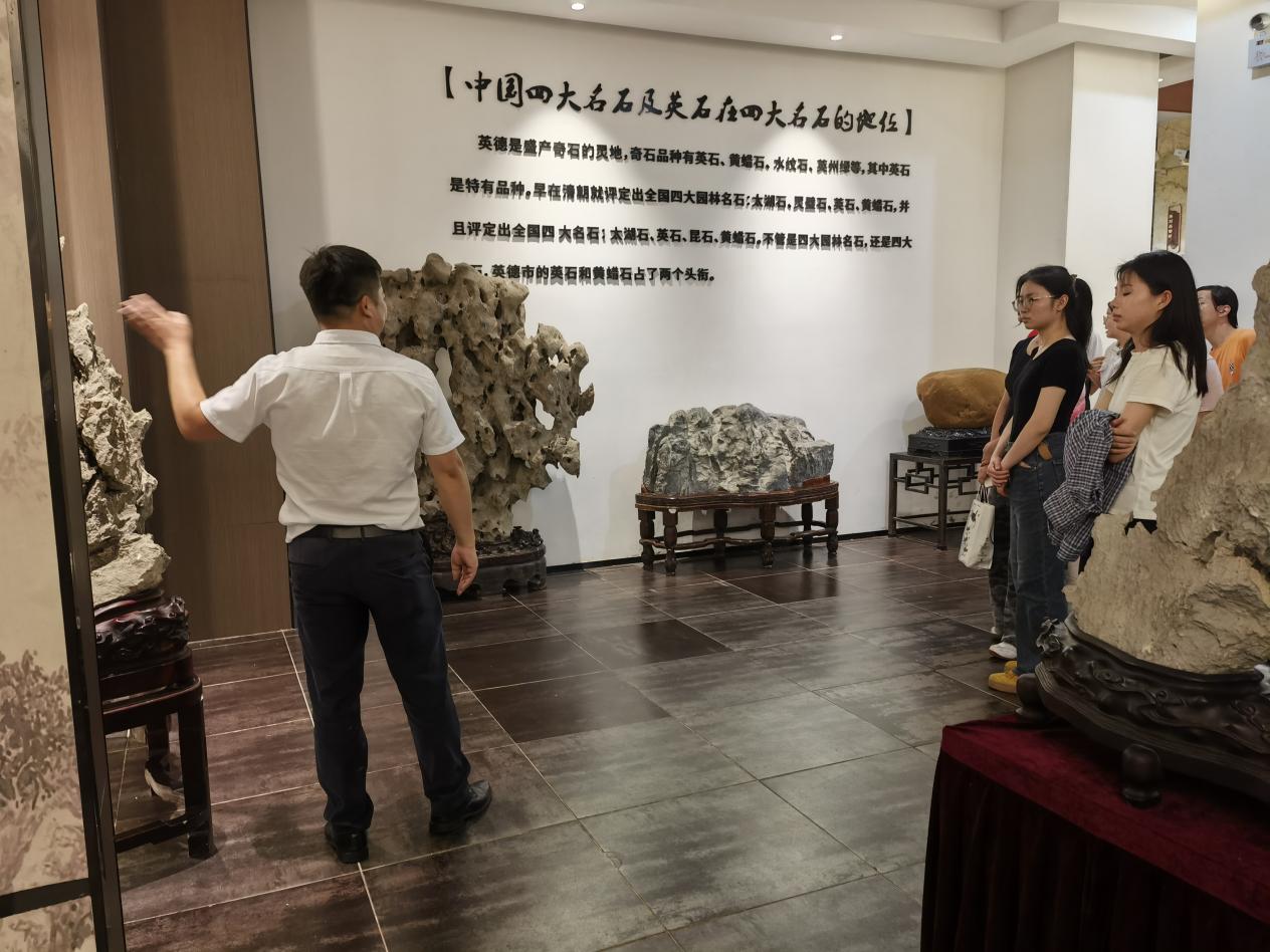 在英德市文化广电旅游体育局相关负责同志带领下,8名来自各地高校的英德籍优秀大学毕业生实地走访了集文旅融合、非遗体验于一体的文旅示范点英石园(石头酒店)。通过观赏酒店工艺区英石盆景、碟景及图书角的英石文化书籍,深入了解到石头酒店将英石文化融入景区、酒店,亲身感受到文旅融合赋能乡村振兴的最新实践成果和发展潜力。