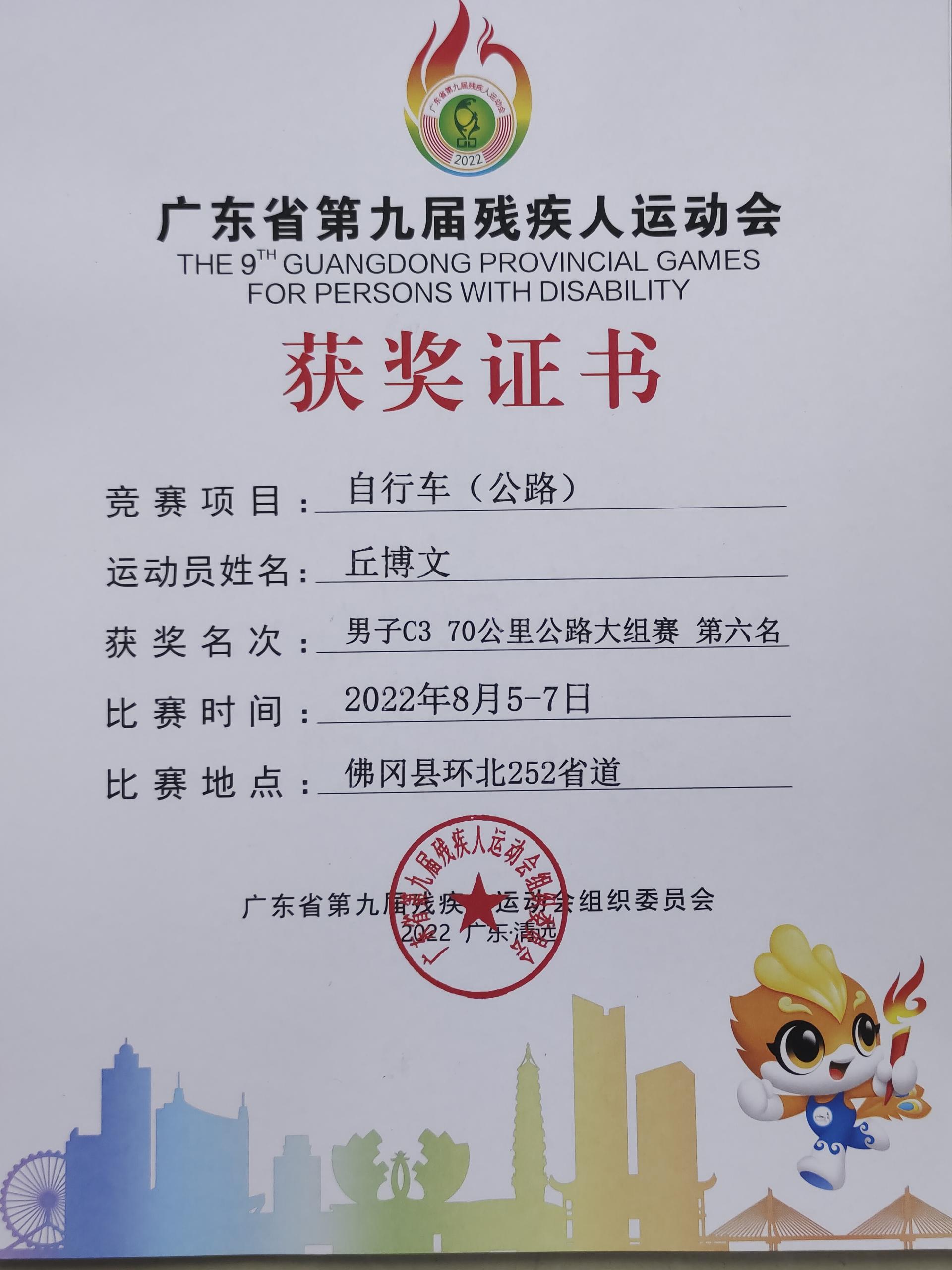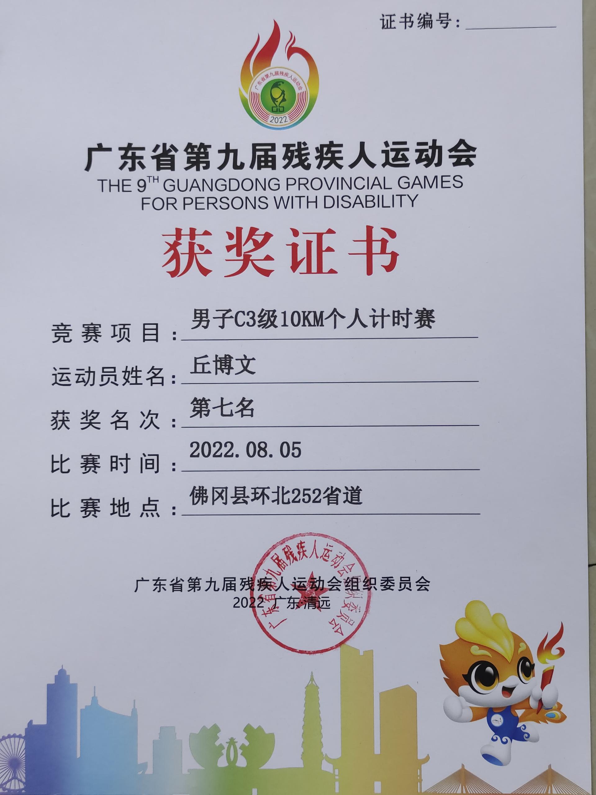 日前,广东省第九届残疾人运动会群体、特奥项目比赛在清远体育中心体育馆副馆正式开赛。我镇残疾人运动员丘博文,分别在男子C3级10km个人计时赛竞赛项目和自行车(70公里公路大组赛)竞赛项目,荣获第七名和第六名。