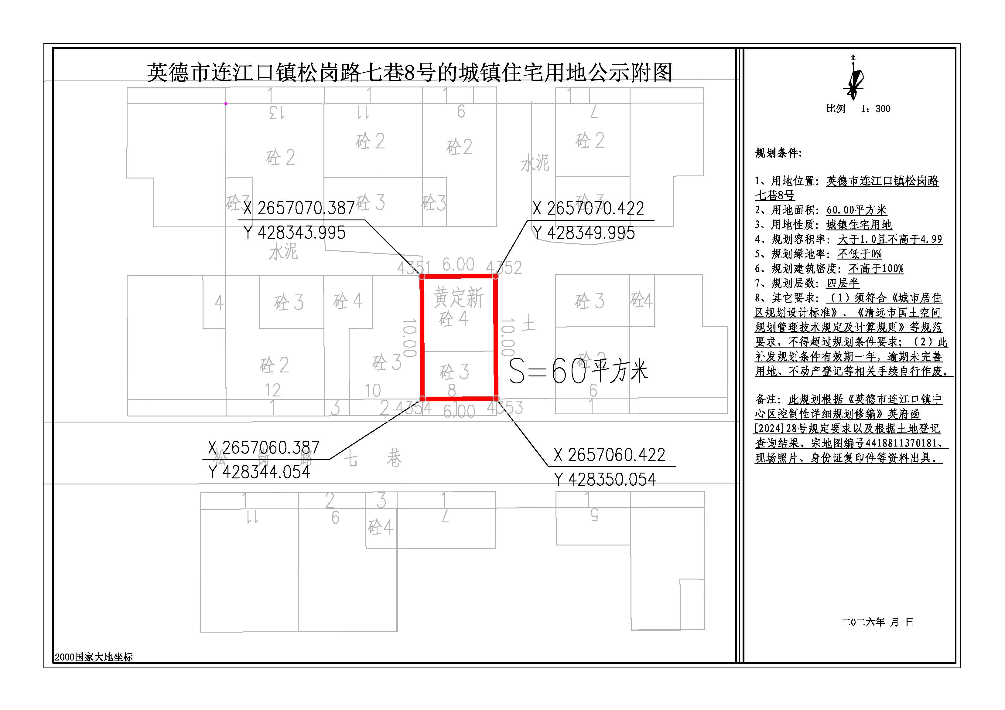 我局收到黄定新关于出具一宗地规划条件的申请。经核查相关资料,该宗城镇住宅用地位于英德市连江口镇松岗路七巷8号,用地面积为60.00平方米。根据《中华人民共和国城乡规划法》、《广东省城乡规划条例》等法律、法规的有关规定,我局决定对上述事项进行批前网上公示,征求相关利益关系人的意见。