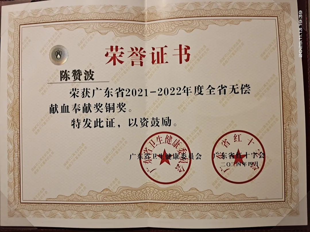 十七载热血续航,爱心献血守护生命。据了解,这位在危急时刻沉着施救的送货司机,日常生活中始终怀揣着乐于助人的热忱。陈赞波自2008年首次献血以来,已坚持无偿献血17次,累计献血量达4200毫升,相当于一个成年人全身的血量,曾荣获2021-2022年度广东省无偿献血奉献奖铜奖,用滚烫的热血为无数生命点亮了希望。