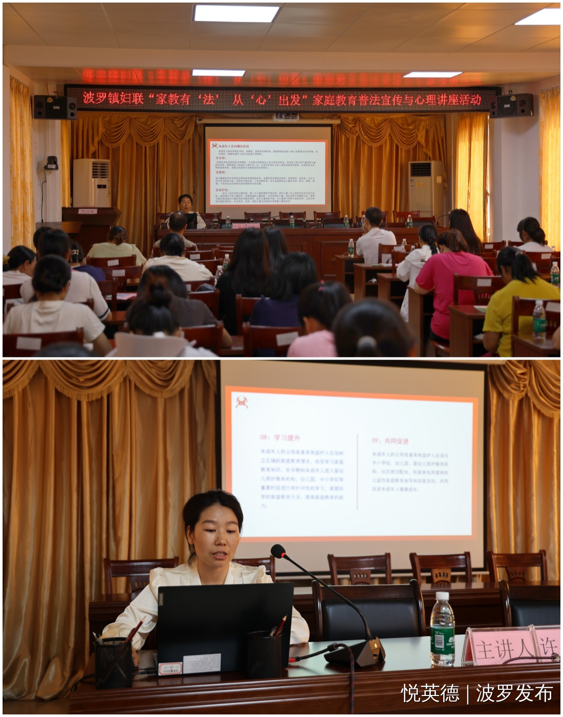 家庭是人生的第一所学校,父母是孩子的第一任老师。为深入推动《家庭教育促进法》《中华人民共和国未成年人保护法》落地落实,引导家长增强法治意识,树立科学的教育理念和方法,提升家庭教育质量,推进“爱心妈妈”结对关爱儿童服务的有效实施,8月20日上午,波罗镇妇联举办“家教有‘法’ 从‘心’出发”家庭教育普法宣传与心理讲座活动。英德市司法局普法与依法治理股股长宋庆武,浈阳律师事务所律师许泉洁,清远市明心心理驿站心理教练钟文,波罗镇党委委员、妇联主席杨小敏,波罗镇村妇联干部,家长代表,“邻家爱心妈妈”代表等共50余人参加了本次活动。