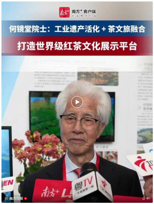中国工程院院士何镜堂在全省高质量发展大会英德红茶展位接受媒体采访