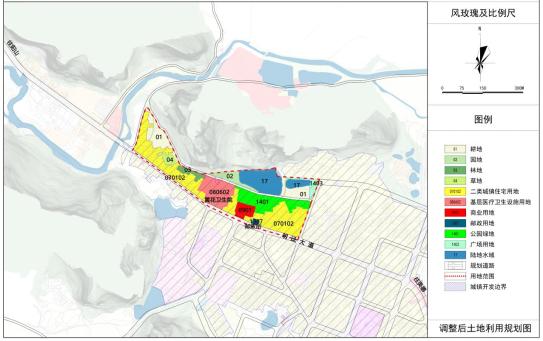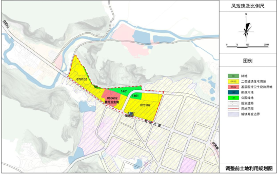 调整前用地总面积为10.85公顷,其中二类居住用地6.95公顷,公园护绿地1.21公顷,公共管理与公共服务用地1.16公顷,公用设施用地0.04公顷,城镇村道路用地1.30公顷。