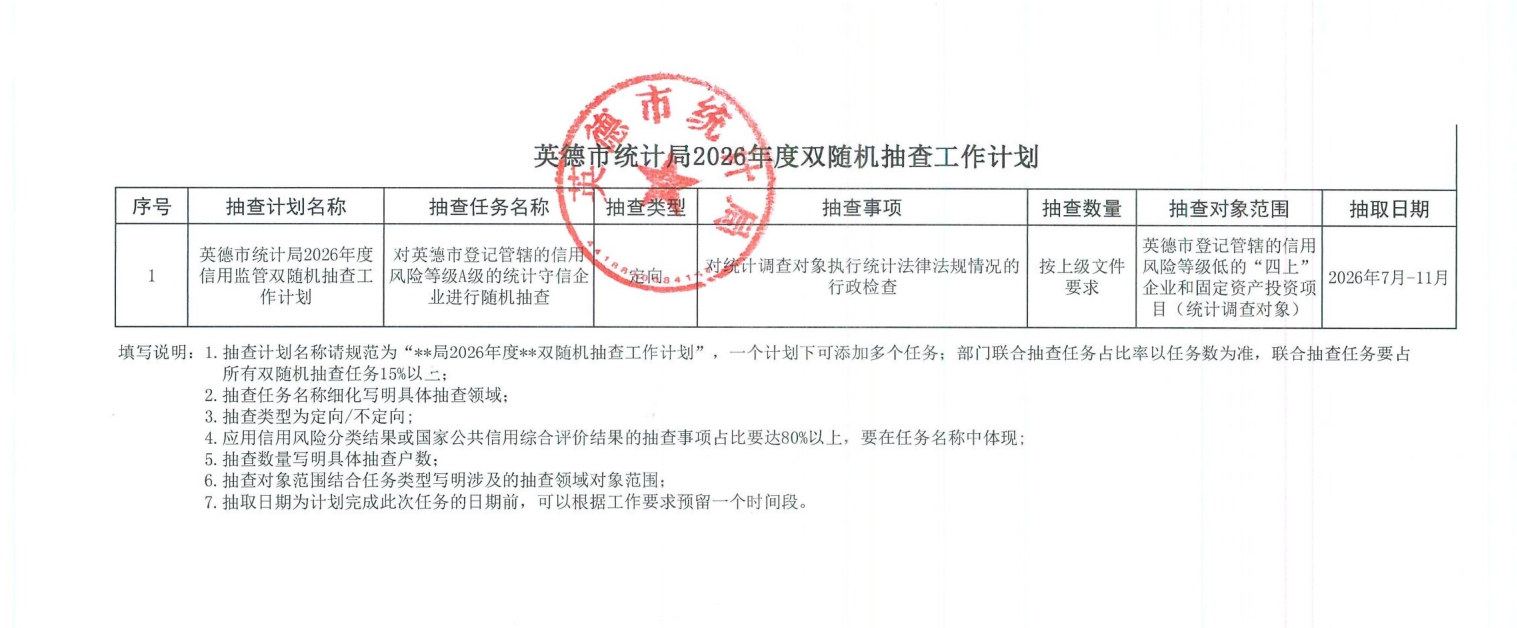 英德市统计局2026年度双随机抽查工作计划