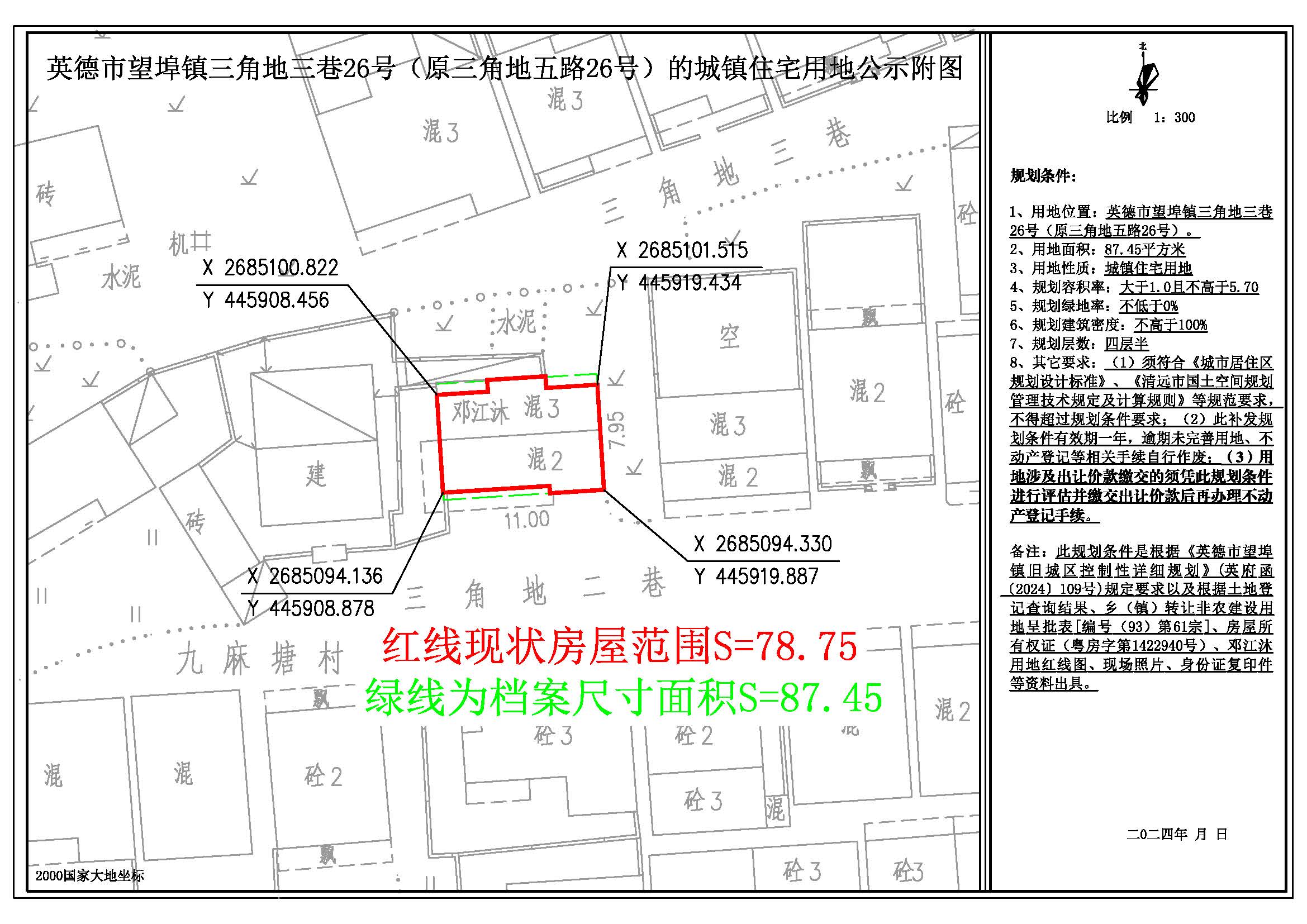 我局收到邓江沐关于出具一宗城镇住宅用地规划条件的申请。经核查相关资料,该宗城镇住宅用地位于英德市望埠镇三角地三巷26号(原三角地五路26号),用地面积为87.45平方米。根据《中华人民共和国城乡规划法》、《广东省城乡规划条例》、《清远市城乡规划局规划公示公布办法》等法律法规的有关规定,我局决定对上述事项进行批前网上公示,征求相关利益关系人的意见。