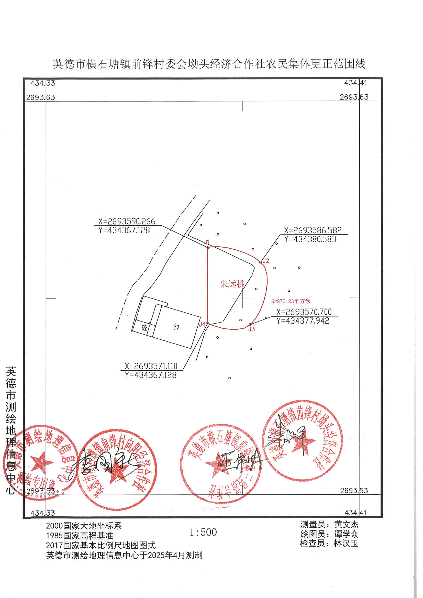 英德市横石塘镇前锋村坳头经济合作社农民集体向我局申请更正登记位于英德市横石塘镇前锋村的1宗农民集体所有权土地(具体位置见附图),宗地面积270.23平方米。上述土地在农村集体土地所有权调查确权时,误将其指认为英德市横石塘镇前锋村坳头与下巫三与向阳经济合作社农民集体共有。经相关权利人实地指认,上述土地实际属于英德市横石塘镇前锋村坳头经济使合作社农民集体所有。现对申请权属更正情况进行公告,如对公告有异议者,请在公告后15个工作日内向市自然资源局提出书面意见;如无异议,我局将予以更正登记。