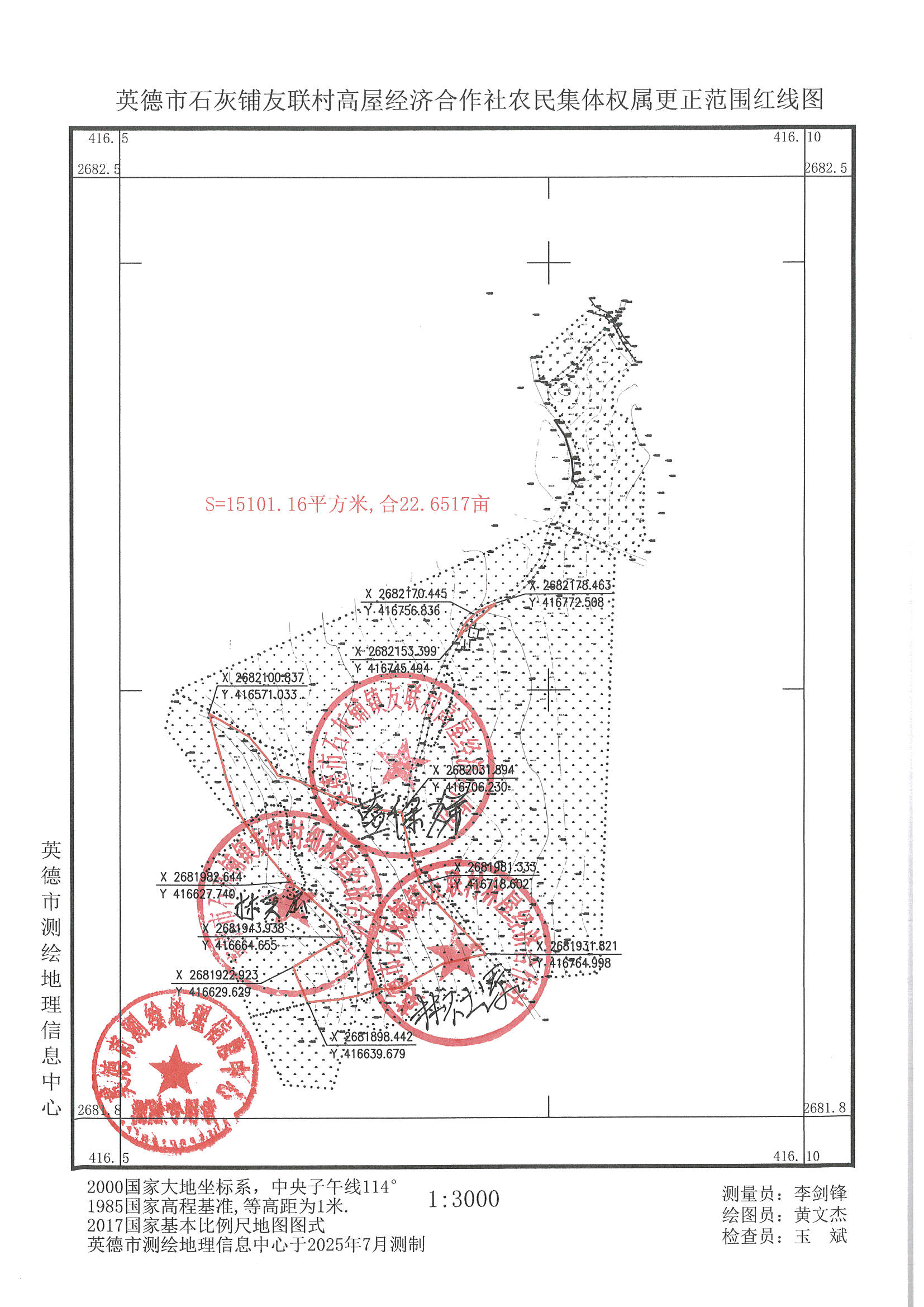 英德市石灰铺镇友联村高屋经济合作社农民集体向我局申请更正登记位于英德市石灰铺友联村的2宗农民集体所有权土地(具体位置见附图),宗地总面积15101.16平方米。上述2宗土地在农村集体土地所有权调查确权时,将其中13358.46平方米的土地误指认为英德市石灰铺镇友联村高屋与细林屋经济合作社农民集体共有,1742.70平方米的土地误指认英德市石灰铺镇友联村林屋经济合作社农民集体。经相关权利人实地指认,上述2宗土地实际属于英德市石灰铺镇友联村高屋经济合作社农民集体所有。现对申请权属更正情况进行公告,如对公告有异议者,请在公告后15个工作日内向市自然资源局提出书面意见;如无异议,我局将予以更正登记。