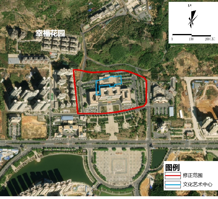 修正地块位于英德中心城区XZ03单元02街坊,共88801平方米(约133亩)。地块范围内目前已基本建成,为英德市人民政府以及文化艺术中心。由于文化艺术中心已单独发证,需结合证载用地性质与建设用地规划许可证中明确的控制指标进行修正。