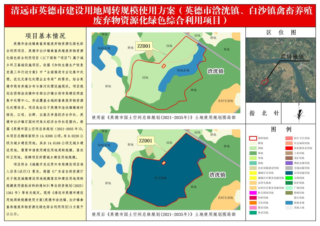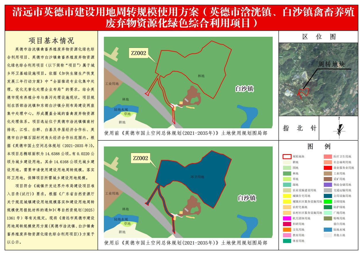 根据《广东省自然资源厅关于规范城镇建设用地规模落实和建设用地周转规模使用报批材料的通知》(粤自然资规划〔2025〕1361号)等有关规定,现将《清远市英德市建设用地周转规模使用方案(英德市浛洸镇、白沙镇禽畜养殖废弃物资源化绿色综合利用项目)》公示如下: