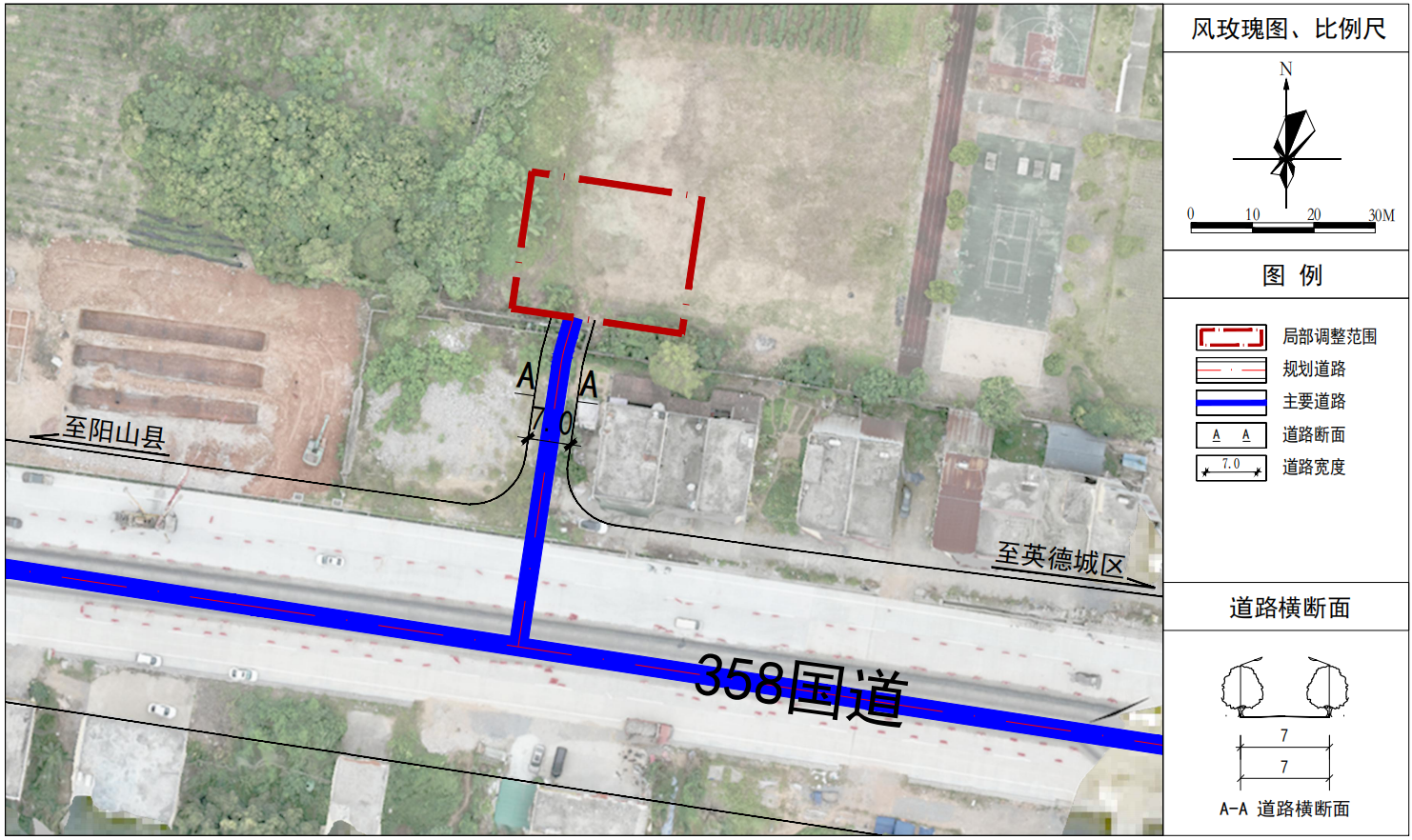 规划区南侧规划一条道路,道路宽度为7米,道路断面为一块板,接358国道。