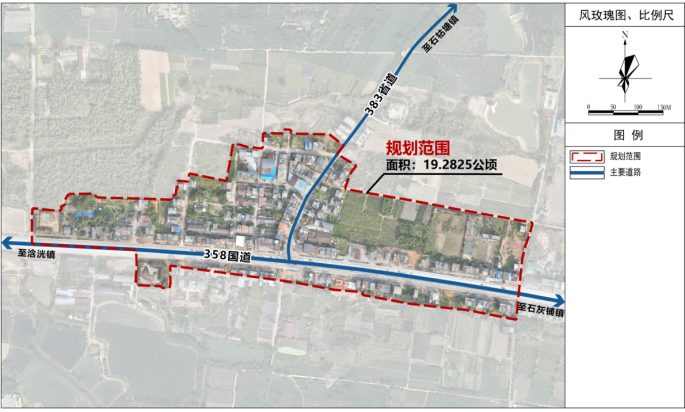 规划区位于英德市英红镇红光社区358国道与383省道交汇处及其周边,总面积为19.2825公顷。