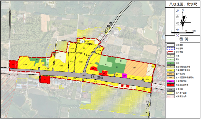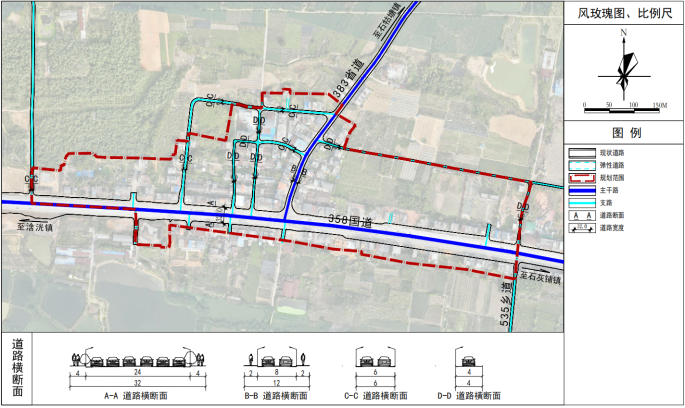 规划区以358国道与383省道为主要对外交通通道。规划区道路等级分为主干道和支路两个等级,主干道道路红线宽度12-32米,主要包括358国道及383省道,支路道路红线宽度4-6米。