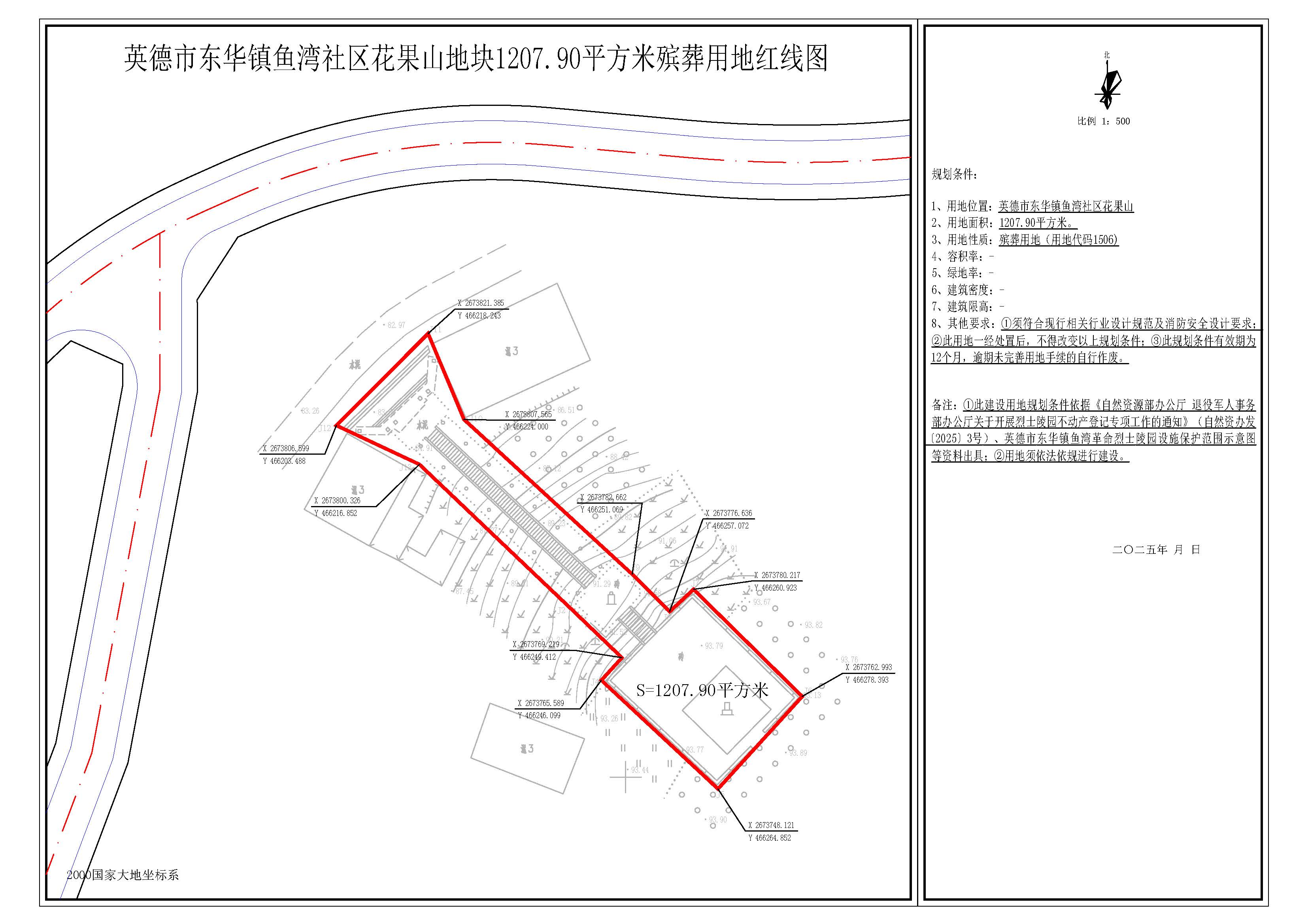 我局收到英德市东华镇人民政府关于出具一宗用地规划条件的申请。经核查,该用地位于英德市东华镇鱼湾社区花果山,面积1207.90平方米,为殡葬用地。根据《中华人民共和国城乡规划法》、《广东省城乡规划条例》等法律、法规的有关规定,我局决定对上述地块的规划条件进行批前网上公示,征求相关利益关系人的意见。