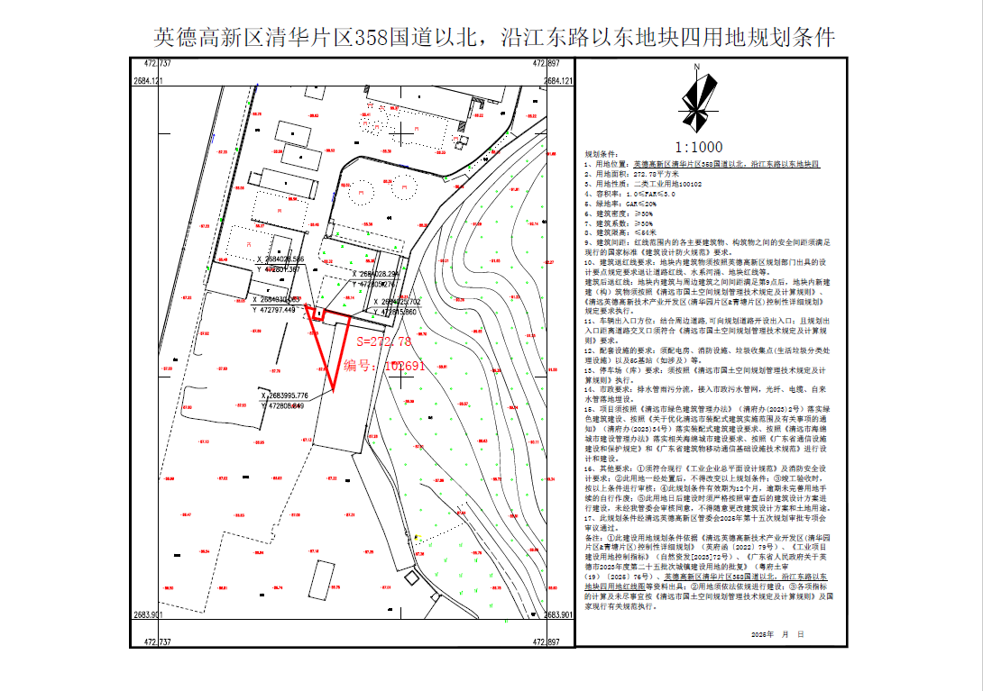 该用地位于英德高新区清华片区358国道以北,沿江东路以东地块四,用地面积为272.78平方米。清远英德高新技术产业开发区管理委员会现申请核发上述用地的规划条件。根据《中华人民共和国城乡规划法》《广东省城乡规划条例》《清远市城乡规划局规划公示公布办法》等法律法规的有关规定,本管委会决定对上述事项进行批前网上公示。