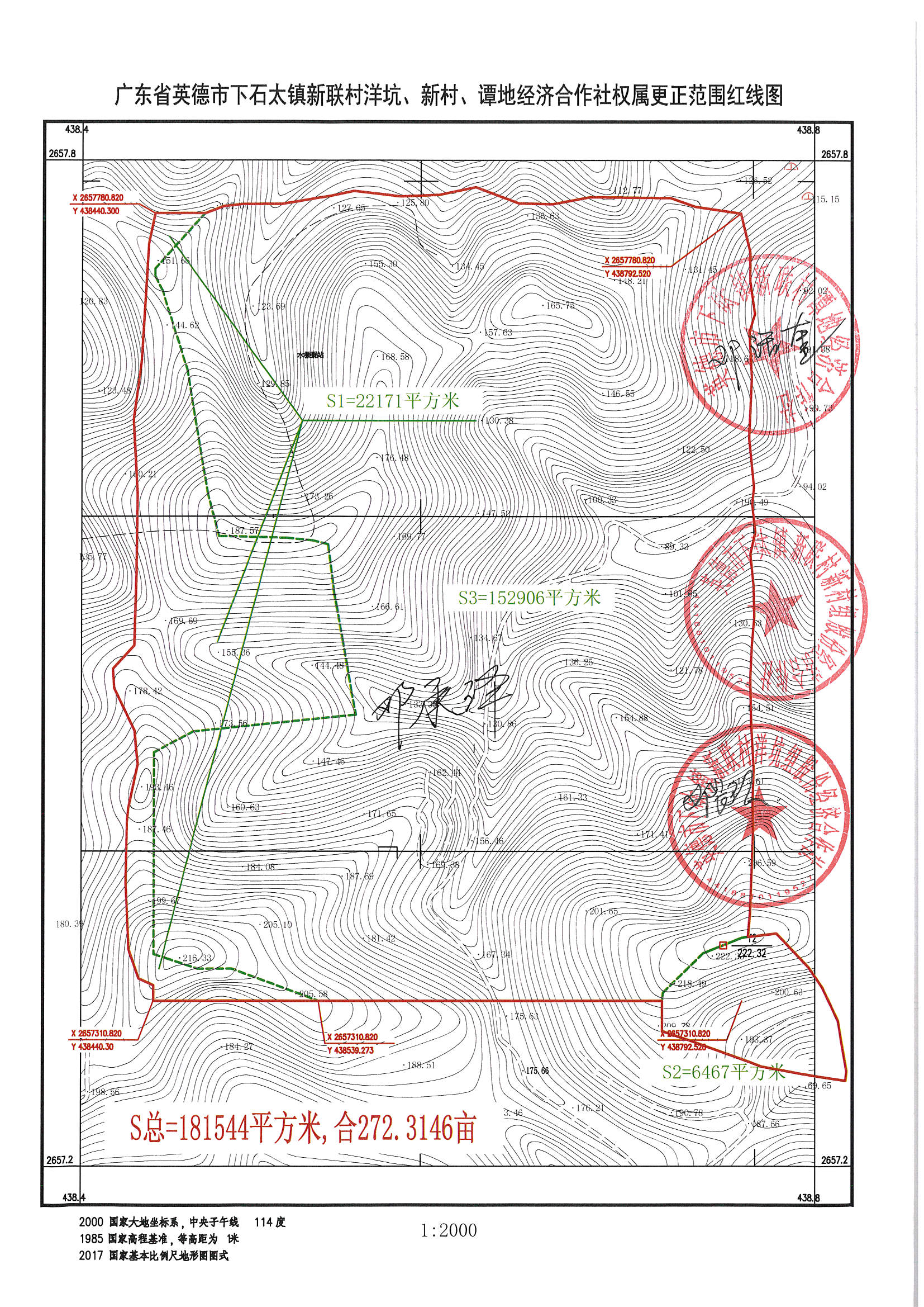 英德市下太镇新联村洋坑组股份经济合作社农民集体、英德市下太镇新联村新村组股份经济合作社农民集体、英德市下太镇新联村谭地经济合作社农民集体向我局申请更正登记位于英德市下太镇新联村的1宗农民集体所有权土地(具体位置见附图),宗地面积181544平方米。上述土地在农村集体土地所有权调查确权时,其中20755平方米误将其指认为英德市下太镇新联村洋坑组股份经济合作社农民集体所有,152906平方米误将其指认为英德市下太镇新联村新村组股份经济合作社农民集体所有,6467平方米误将其指认为英德市下太镇新联村谭地经济合作社农民集体所有,1416平方米误将其指认为英德市下太镇新联村谭地经济合作社农民集体与洋坑经组股份经济合作社农民集体争议地。经相关权利人实地指认,上述土地实际属于英德市下太镇新联村洋坑组股份经济合作社农民集体、英德市下太镇新联村新村组股份经济合作社农民集体、英德市下太镇新联村谭地经济合作社农民集体按比例共有,其中英德市下太镇新联村洋坑组股份经济合作社农民集体占比12.22%,英德市下太镇新联村谭地经济合作社农民集体占比3.56%,英德市下太镇新联村新村组股份经济合作社农民集体占比84.22%。现对申请权属更正情况进行公告,如对公告有异议者,请在公告后15个工作日内向市自然资源局提出书面意见;如无异议,我局将予以更正登记。