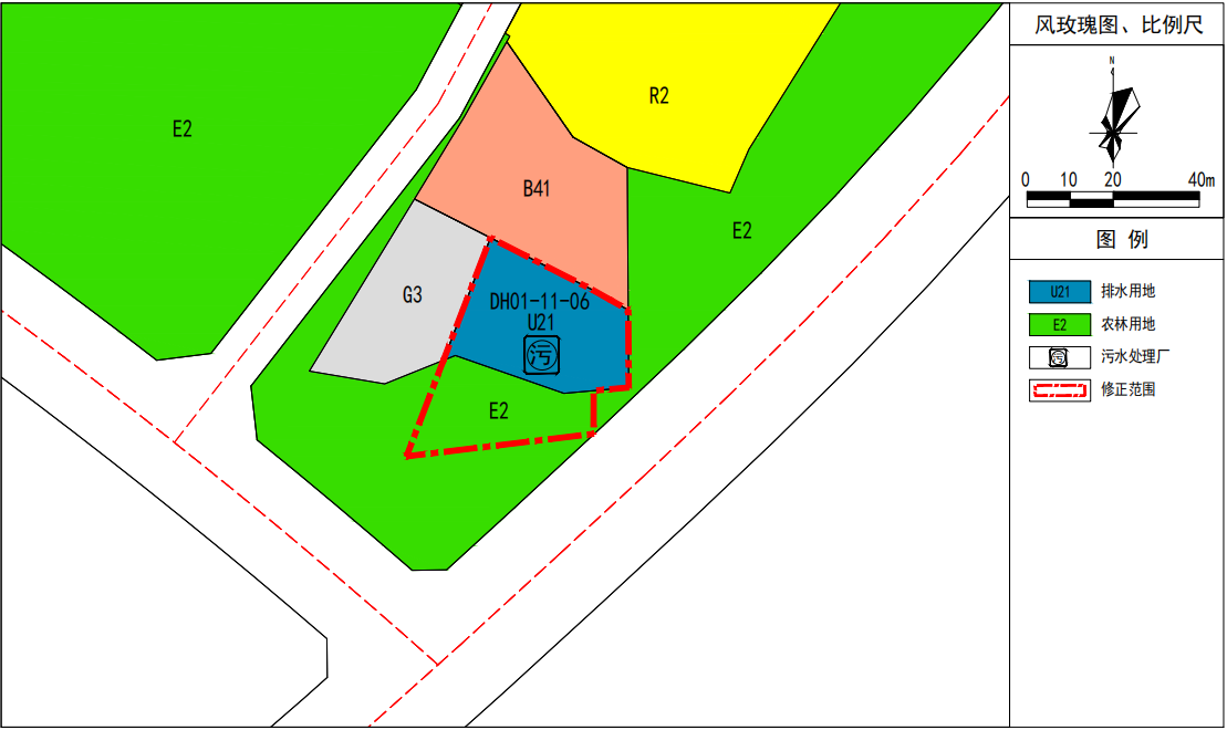 将DH01-11-06地块排水用地(U21)用地性质修正为排水用地(1302),用地面积991㎡修正为1552㎡,控制指标保持不变。