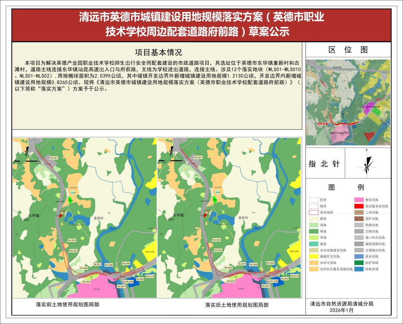 根据《广东省自然资源厅关于做好城镇开发边界管理的通知(试行)》(粤自然资发〔2024〕4号)《广东省自然资源厅关规范城镇建设用地规模落实和建设用地周转规模使用报批材料的通知》(粤自然资发〔2025〕1361号)等有关规定,现将《清远市英德市城镇建设用地规模落实方案(英德市职业技术学校周边配套道路府前路)》公示如下: