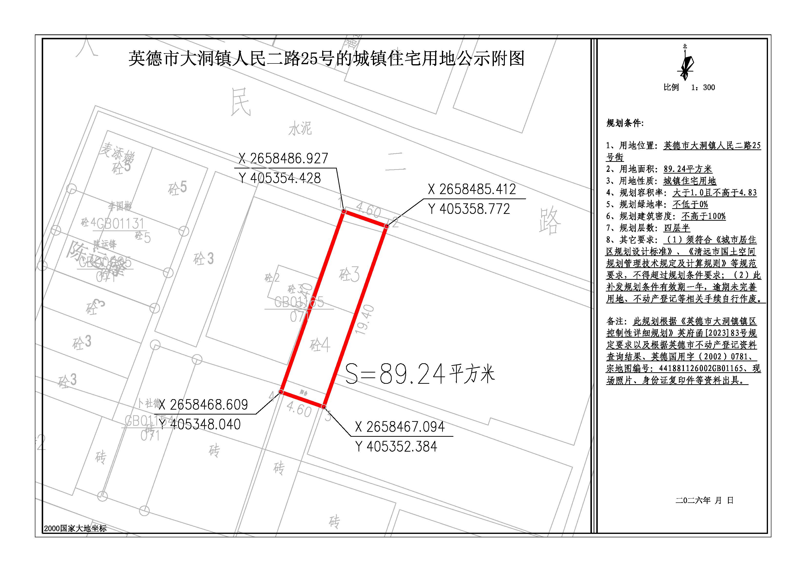 关于出具英德市大洞镇人民二路25号89.24平方米城镇住宅用地规划条件的批前网上公示