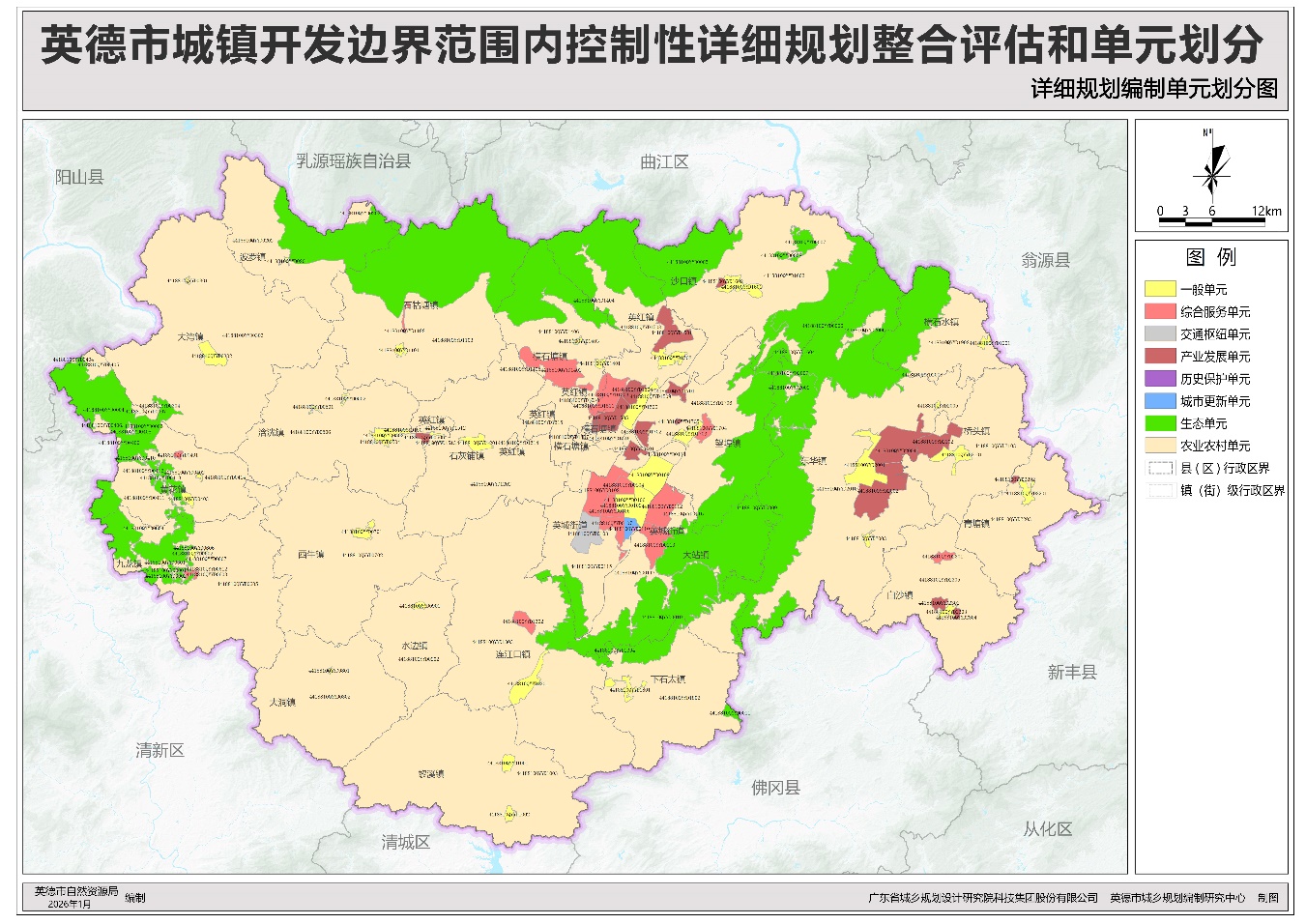 根据《广东省自然资源厅关于推进城镇开发边界内详细规划评估及编制工作的通知》(粤自然资函〔2023〕207号)及《广东省城镇开发边界内详细规划单元划分指南(试行)》等文件有关规定,《英德市详细规划编制单元划分》已完成技术审查、批前公示等程序,并经英德市国土空间规划委员会审议通过后获英德市人民政府批准(英府函〔2026〕13号),自批准之日(2026年2月5日)起生效。现按程序将《英德市详细规划编制单元划分》(批复稿)公告如下: