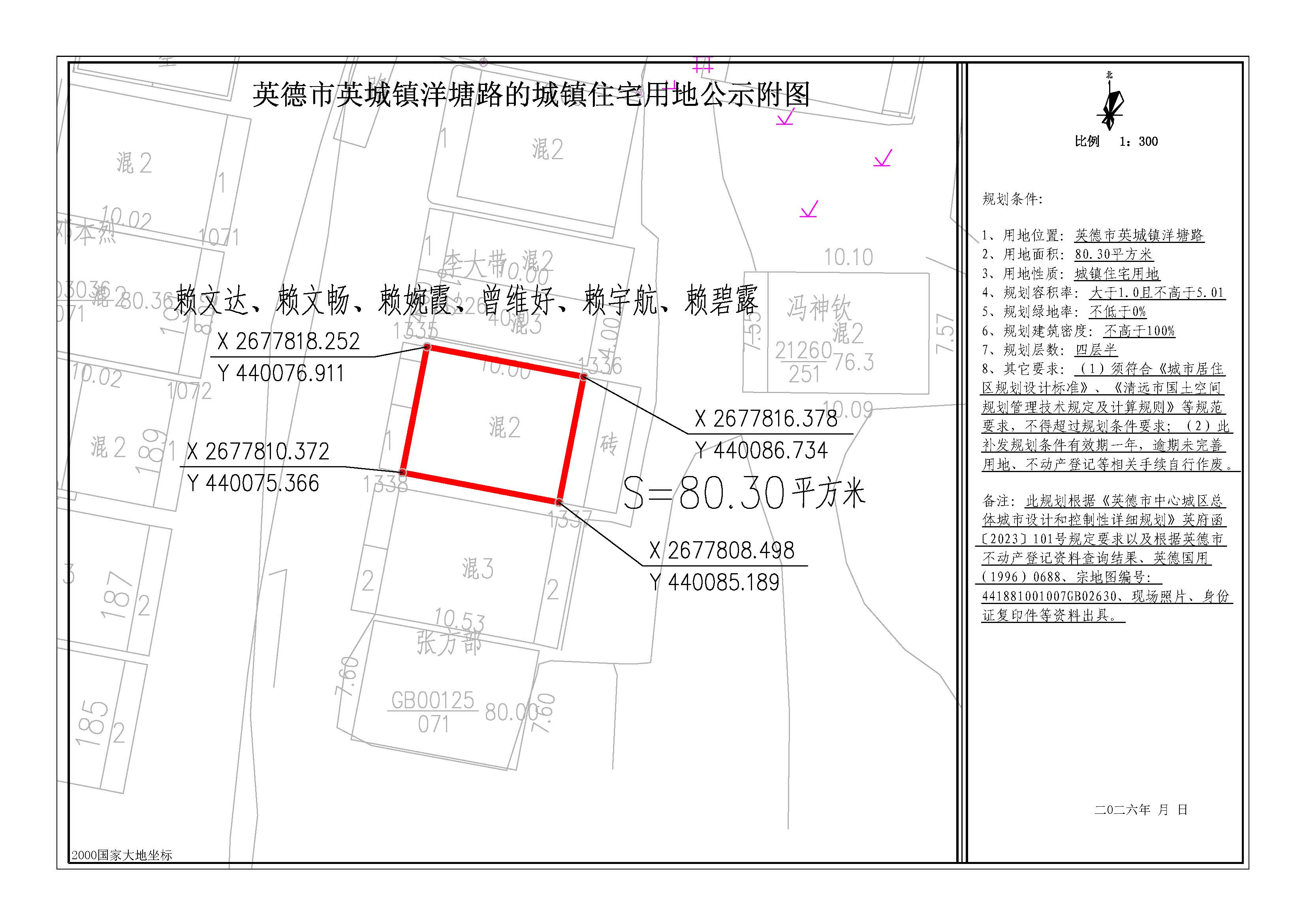 我局收到赖文达、赖文畅、赖婉霞、曾维好、赖宇航、赖碧露关于出具一宗城镇住宅用地规划条件的申请。经核查相关资料,该宗城镇住宅用地位于英德市英城镇洋塘路,用地面积为80.30平方米。根据《中华人民共和国城乡规划法》、《广东省城乡规划条例》等法律、法规的有关规定,我局决定对上述事项进行批前网上公示,征求相关利益关系人的意见。