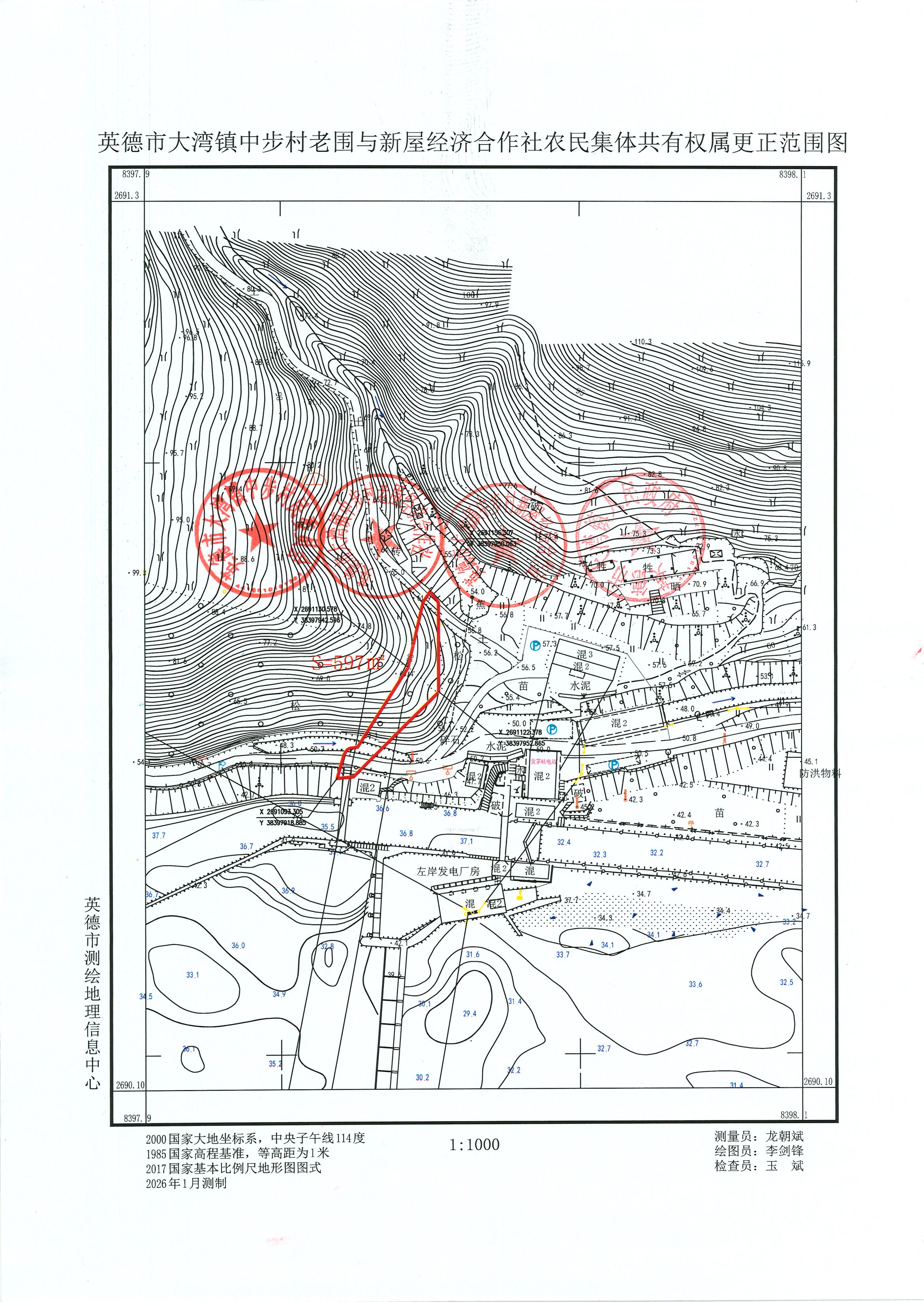 英德市大湾镇中步村老围与新屋经济合作社农民集体向我局申请确认位于英德市大湾镇中步村的1宗宗地面积为597平方米集体土地所有权权属(具体位置见附图),上述土地已由大湾镇人民政府组织相关村经济合作社对该范围进行了现场勘界,现已勘界完毕,相关经济合作社已签字盖章确认,该范围内的土地权属已明确,四至清晰。现对上述土地的权属情况进行公告,如对公告有异议者,请在公告后15个工作日内向市自然资源局提出书面意见;如无异议,我局将予以确权登记。