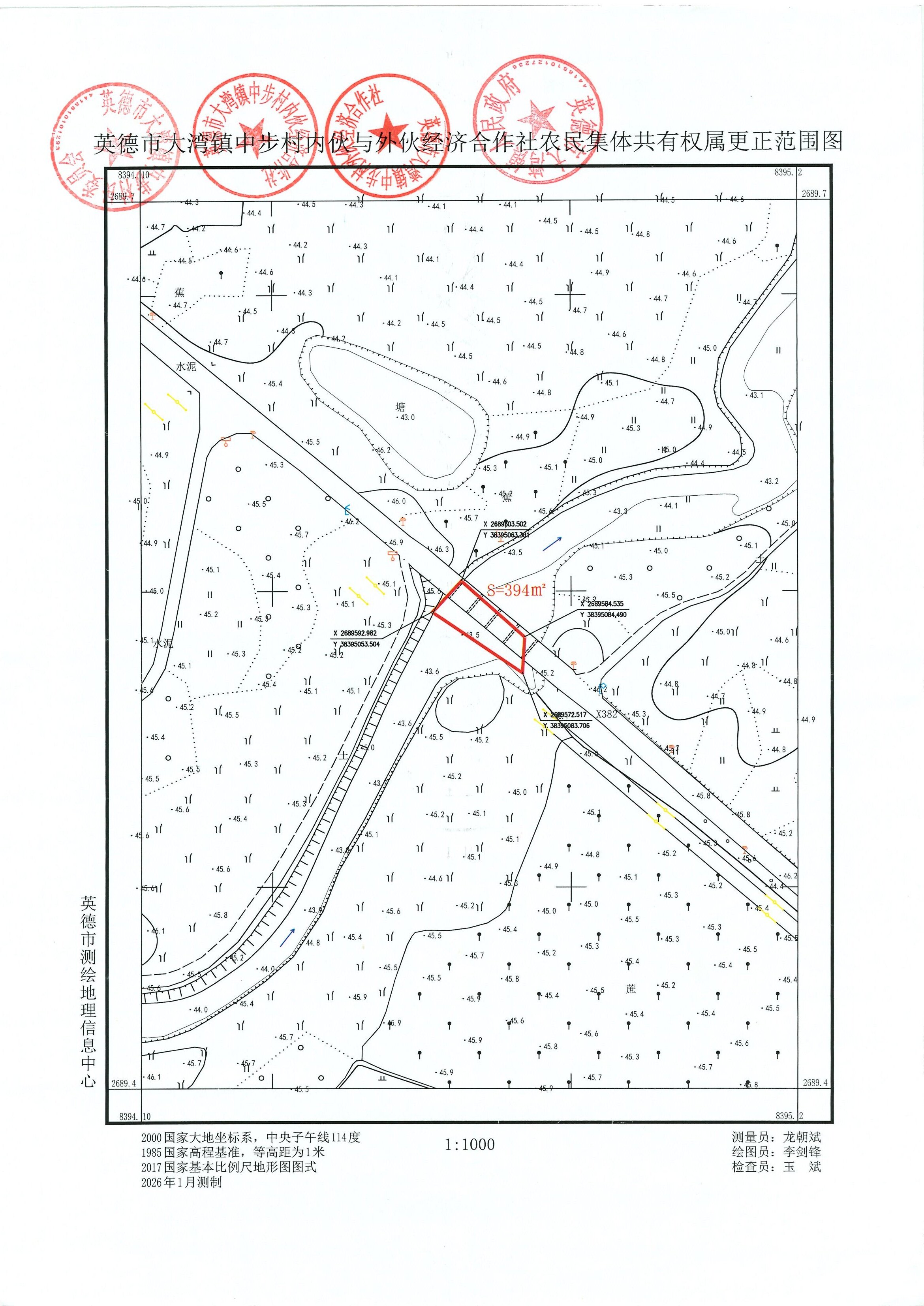 英德市大湾镇中步村内伙与外伙经济合作社农民集体向我局申请确认位于英德市大湾镇中步村的1宗宗地面积为394平方米集体土地所有权权属(具体位置见附图),上述土地已由大湾镇人民政府组织相关村经济合作社对该范围进行了现场勘界,现已勘界完毕,相关经济合作社已签字盖章确认,该范围内的土地权属已明确,四至清晰。现对上述土地的权属情况进行公告,如对公告有异议者,请在公告后15个工作日内向市自然资源局提出书面意见;如无异议,我局将予以确权登记。