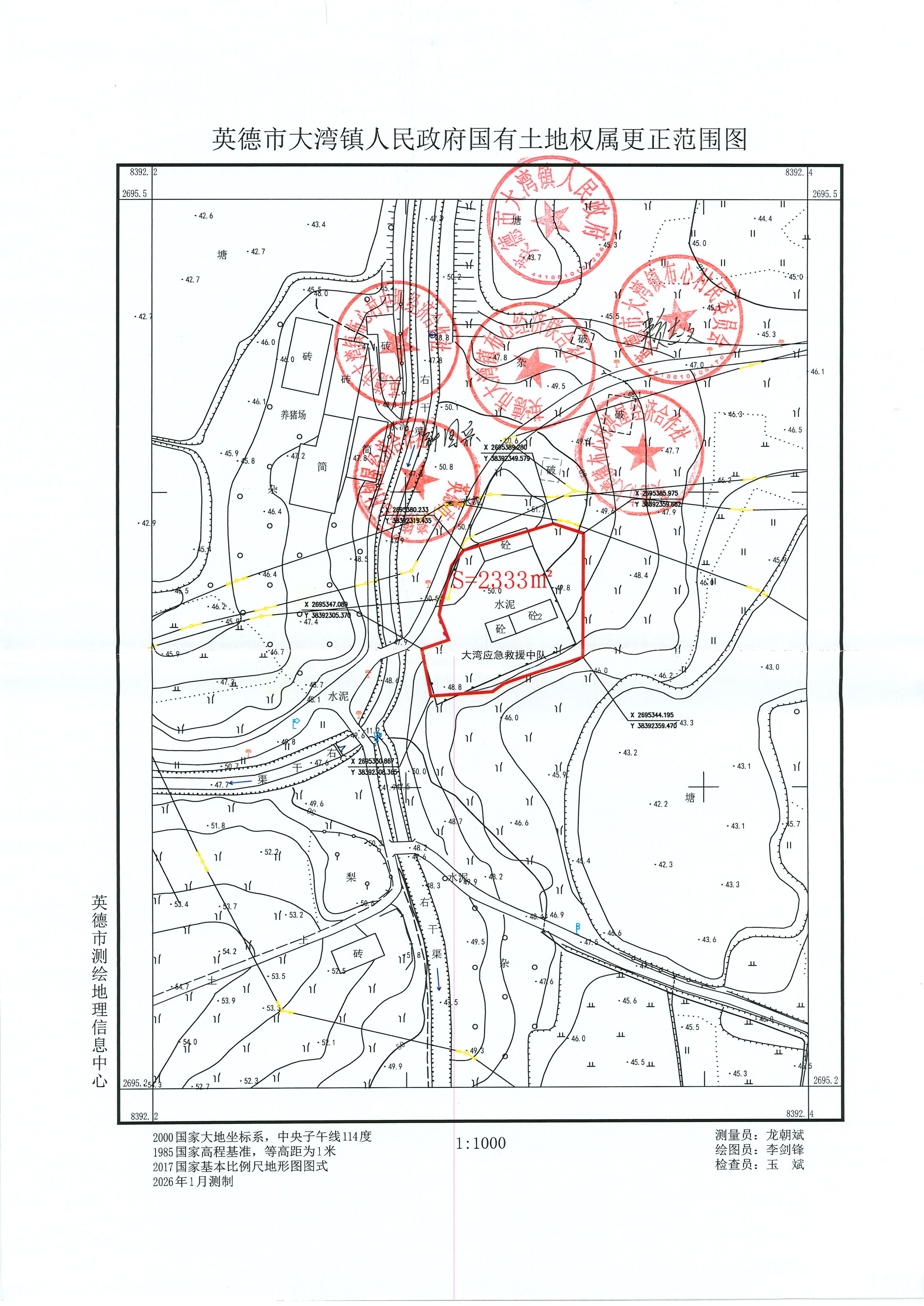 英德市大湾镇人民政府向我局申请确认位于英德市大湾镇中步村的1宗宗地面积为2333平方米集体土地所有权权属(具体位置见附图),上述土地已由大湾镇人民政府组织相关村经济合作社对该范围进行了现场勘界,现已勘界完毕,相关经济合作社已签字盖章确认,该范围内的土地权属已明确,四至清晰,属英德市大湾镇人民政府所有。现对上述土地的权属情况进行公告,如对公告有异议者,请在公告后15个工作日内向市自然资源局提出书面意见;如无异议,我局将予以确权登记。