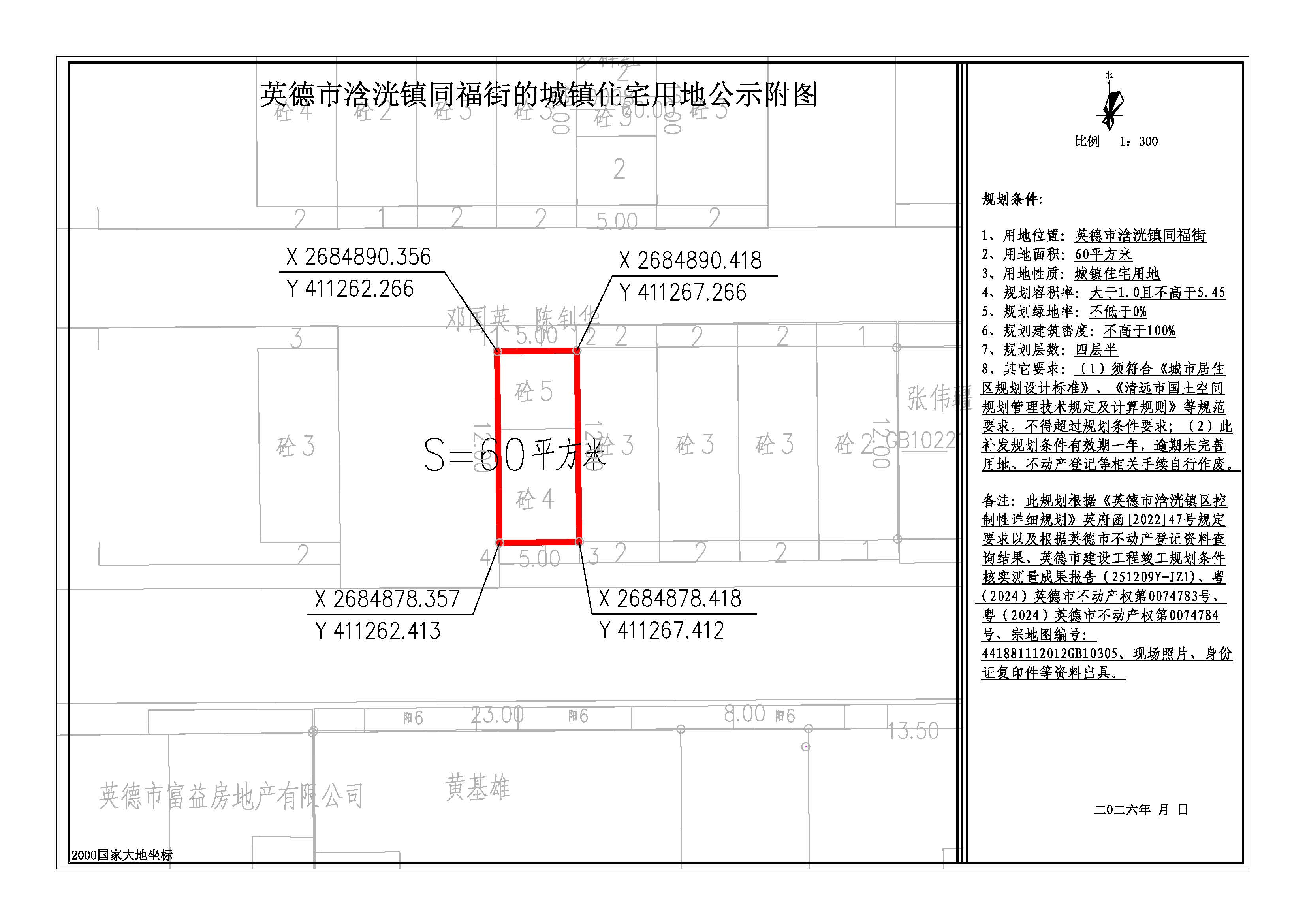 我局收到陈钊华、邓国英关于出具一宗地规划条件的申请。经核查相关资料,该宗城镇住宅用地位于英德市浛洸镇同福街,用地面积为60.00平方米。根据《中华人民共和国城乡规划法》、《广东省城乡规划条例》等法律、法规的有关规定,我局决定对上述事项进行批前网上公示,征求相关利益关系人的意见。