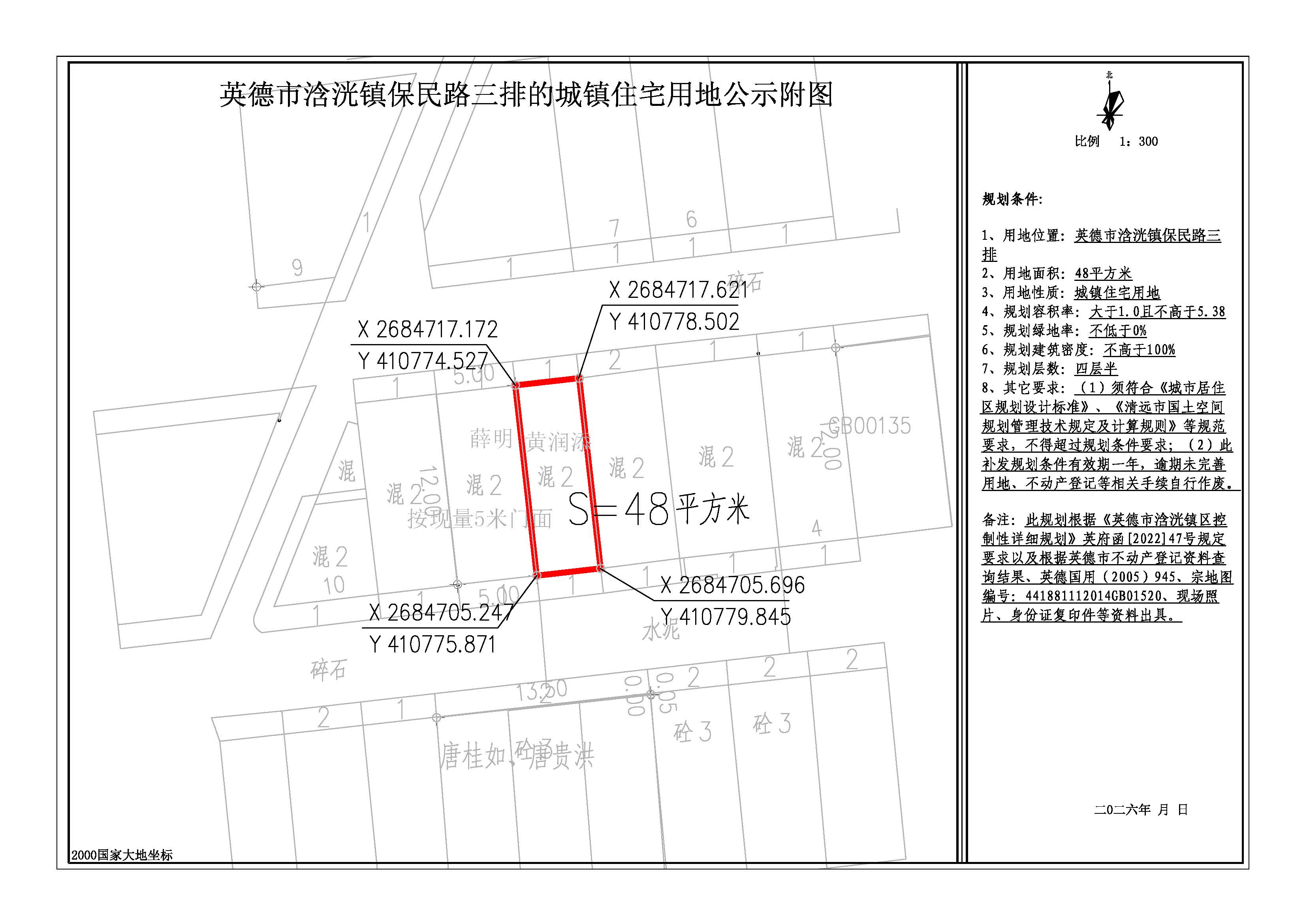 我局收到黄润添关于出具一宗地规划条件的申请。经核查相关资料,该宗城镇住宅用地位于英德市浛洸镇保民路三排,用地面积为48.00平方米。根据《中华人民共和国城乡规划法》、《广东省城乡规划条例》等法律、法规的有关规定,我局决定对上述事项进行批前网上公示,征求相关利益关系人的意见。