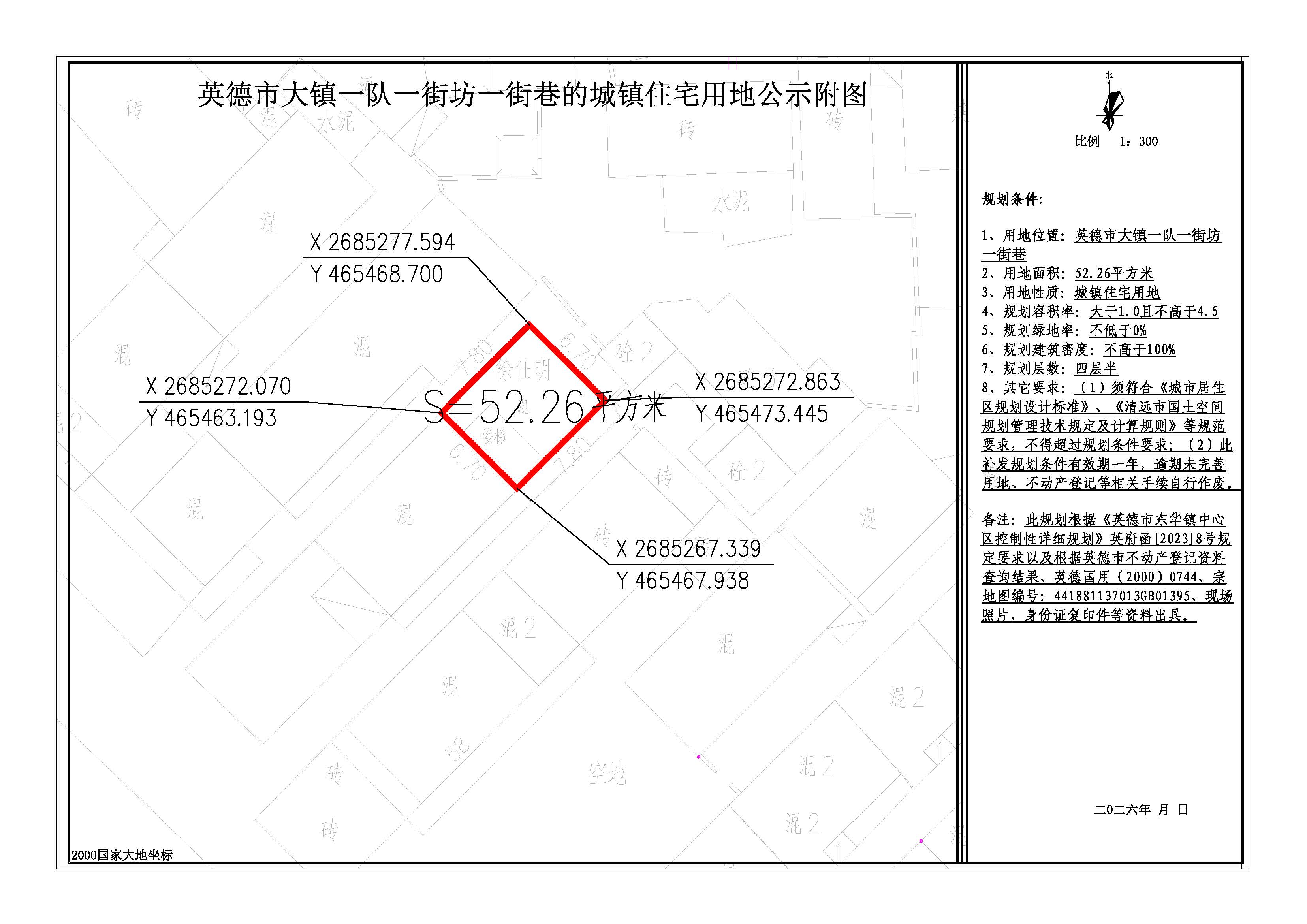 我局收到徐仕明关于出具一宗地规划条件的申请。经核查相关资料,该宗城镇住宅用地位于英德市大镇一队一街坊一街巷,用地面积为52.26平方米。根据《中华人民共和国城乡规划法》、《广东省城乡规划条例》等法律、法规的有关规定,我局决定对上述事项进行批前网上公示,征求相关利益关系人的意见。