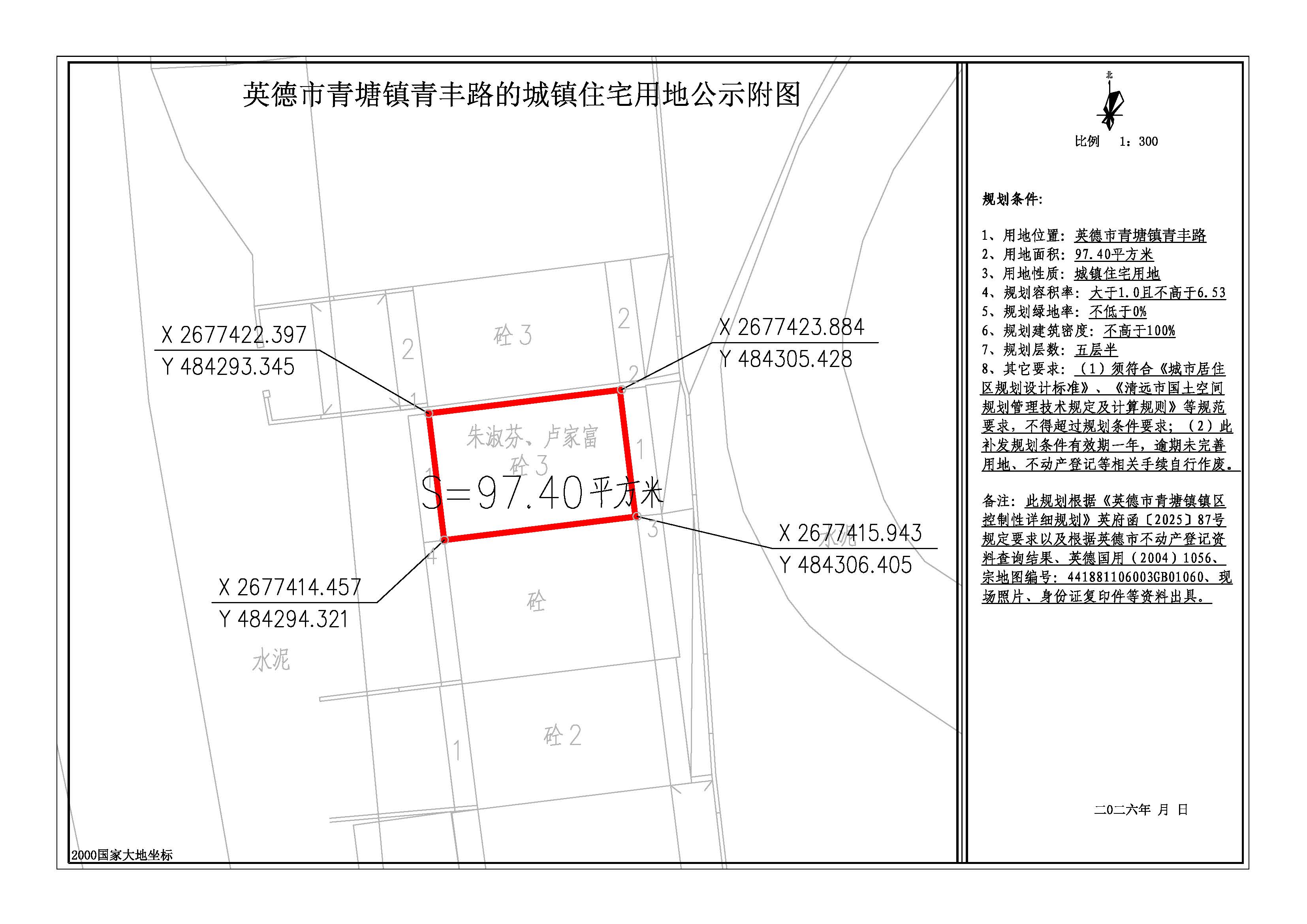 我局收到朱淑芬、卢家富关于出具一宗地规划条件的申请。经核查相关资料,该宗城镇住宅用地位于英德市青塘镇青丰路,用地面积为97.40平方米。根据《中华人民共和国城乡规划法》、《广东省城乡规划条例》等法律、法规的有关规定,我局决定对上述事项进行批前网上公示,征求相关利益关系人的意见。