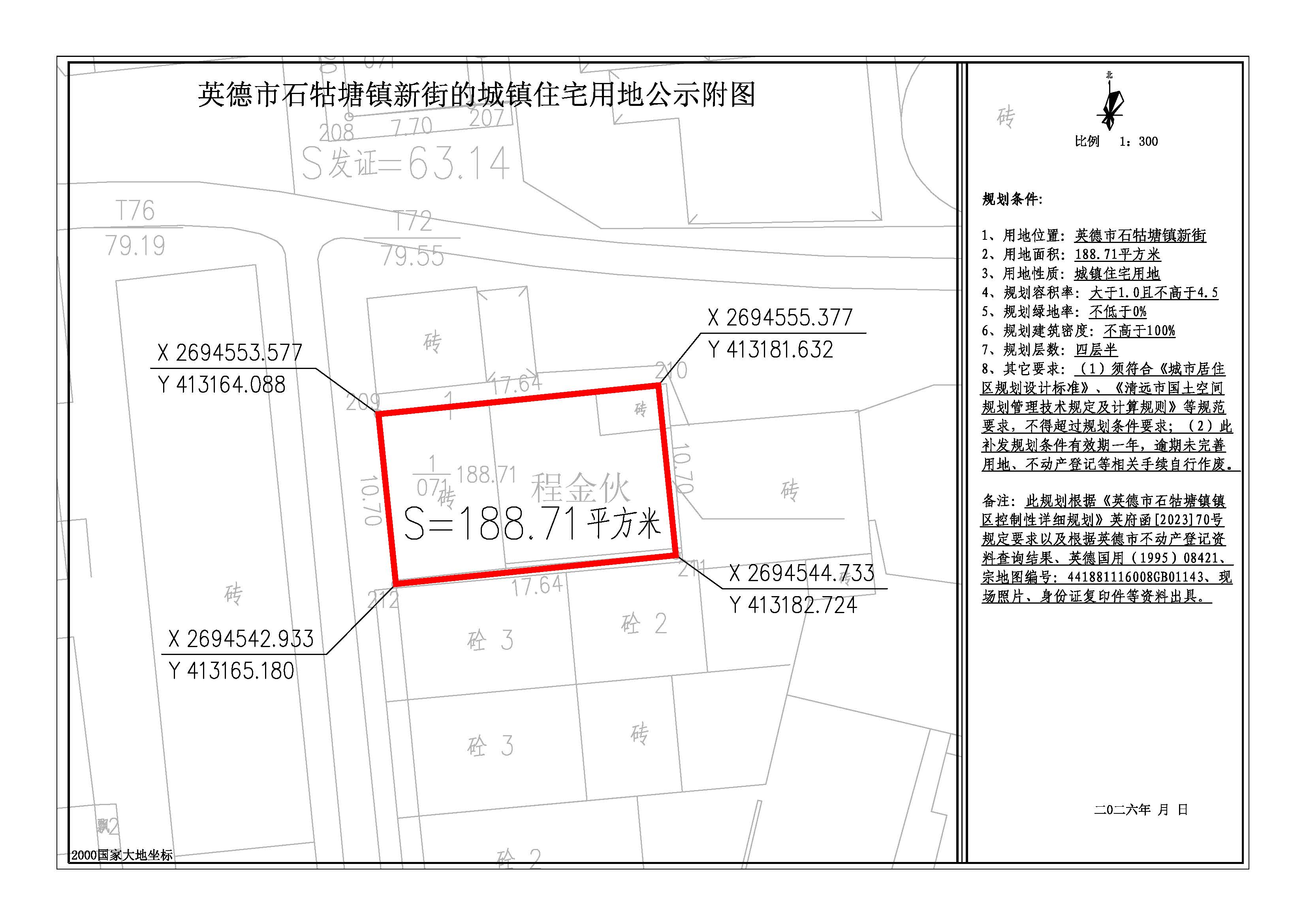 我局收到程金伙关于出具一宗地规划条件的申请。经核查相关资料,该宗城镇住宅用地位于英德市石牯塘镇新街,用地面积为188.71平方米。根据《中华人民共和国城乡规划法》、《广东省城乡规划条例》等法律、法规的有关规定,我局决定对上述事项进行批前网上公示,征求相关利益关系人的意见。