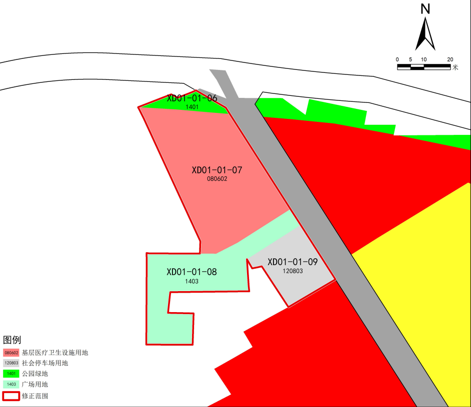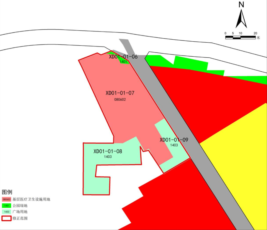根据下石太镇卫生院宗地红线及建设现状,将卫生院宗地红线范围内公园绿地(1401)、广场用地(1403)、社会停车场用地(120803)修正为基层医疗卫生设施用地(080602);基层医疗卫生设施用地(080602)建筑密度控制指标由≤30%修正为≤40%,绿地率控制指标由≥20%修正为≥5%。将卫生院宗地红线范围外社会停车场用地(120803)修正为广场用地(1403)。