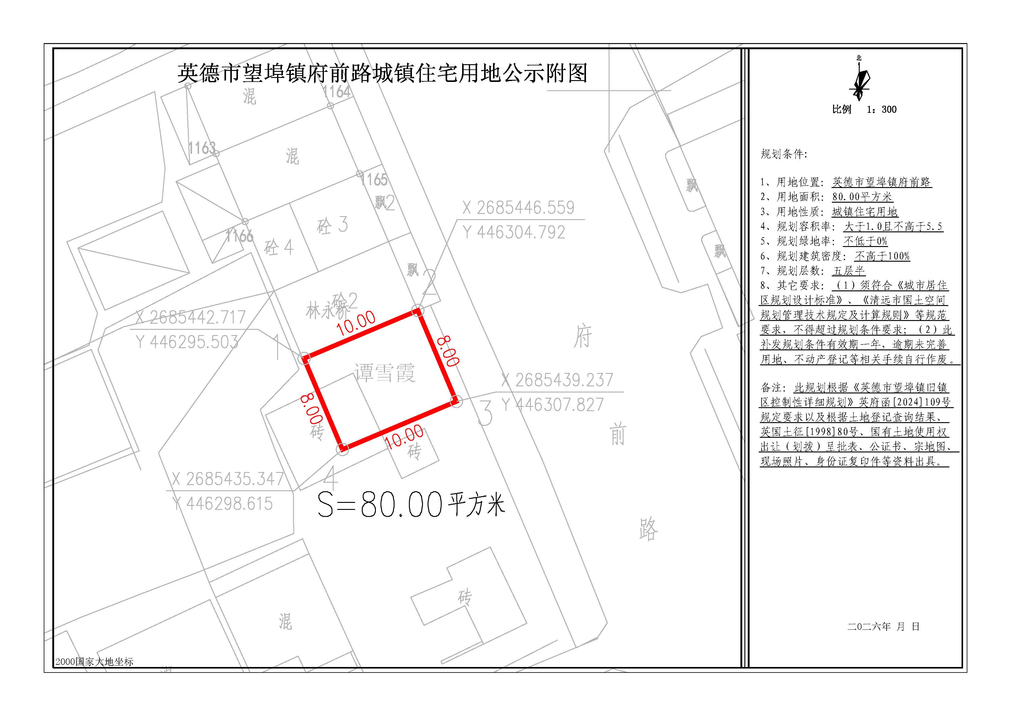我局收到谭雪霞关于出具一宗地规划条件的申请。经核查相关资料,该宗城镇住宅用地位于英德市望埠镇府前路,用地面积为80.00平方米。根据《中华人民共和国城乡规划法》、《广东省城乡规划条例》等法律、法规的有关规定,我局决定对上述事项进行批前网上公示,征求相关利益关系人的意见。
