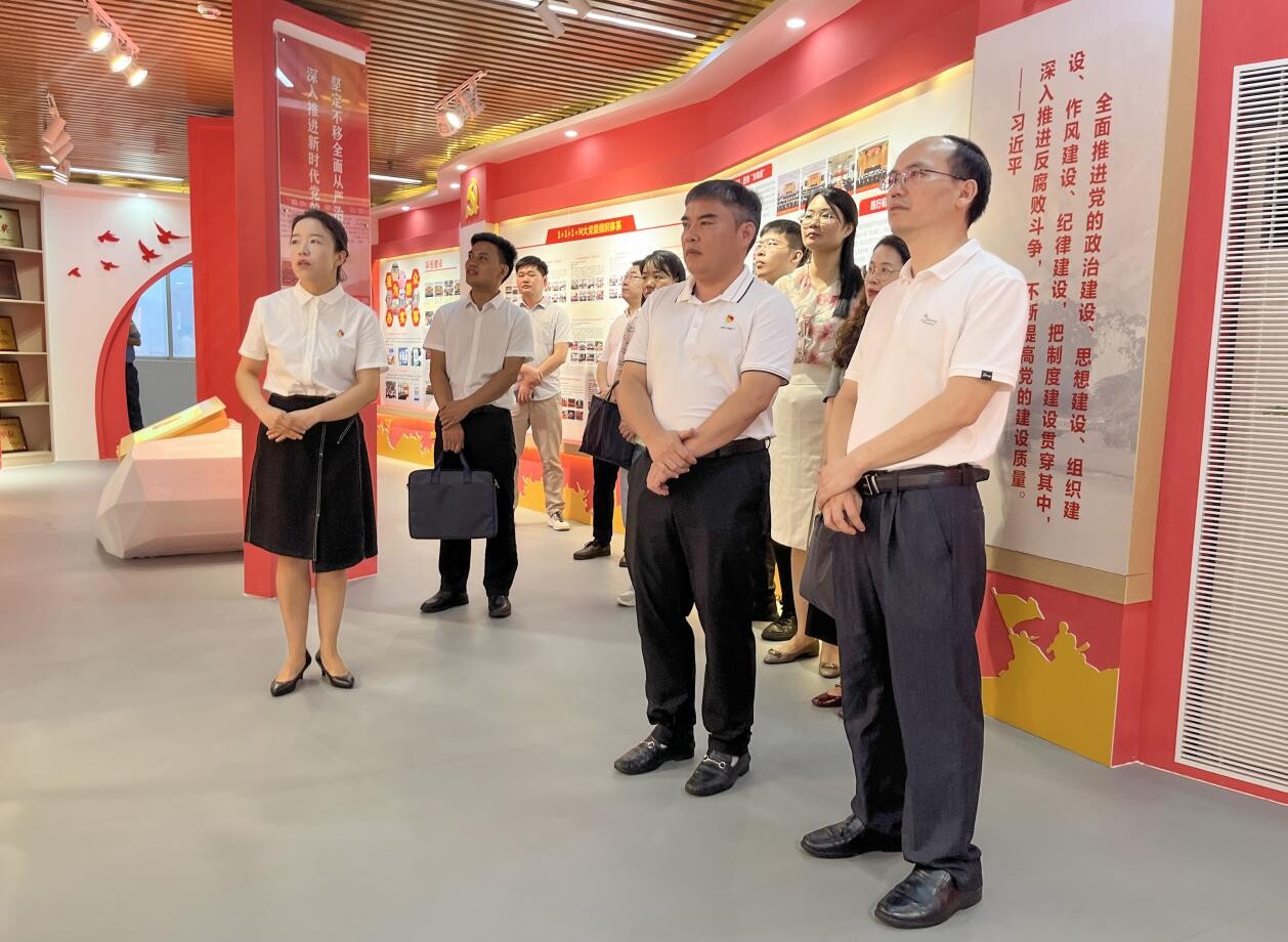 (清远市委组织部部务委员刘美志在财政局十一楼参观党建展示基地)