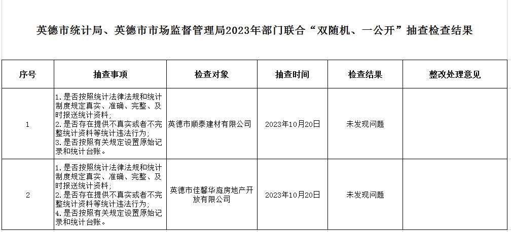 英德市统计局、英德市市场监督管理局2023年部门联合“双随机、一公开”抽查检查结果