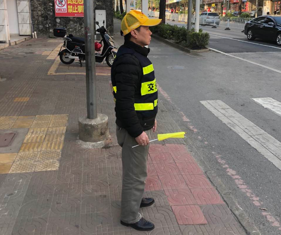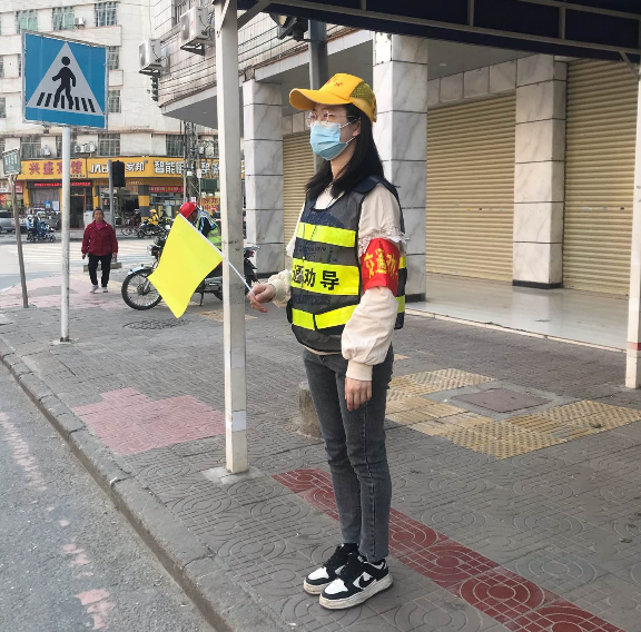 在光明路与和平北路交叉口(红绿灯路口),统一手拿小黄旗,身穿文明交通劝导服,认真引导市民不闯红灯,走斑马线,倡导市民文明行车,对行人横穿马路等不文明交通行为及时劝导,维护交通秩序。