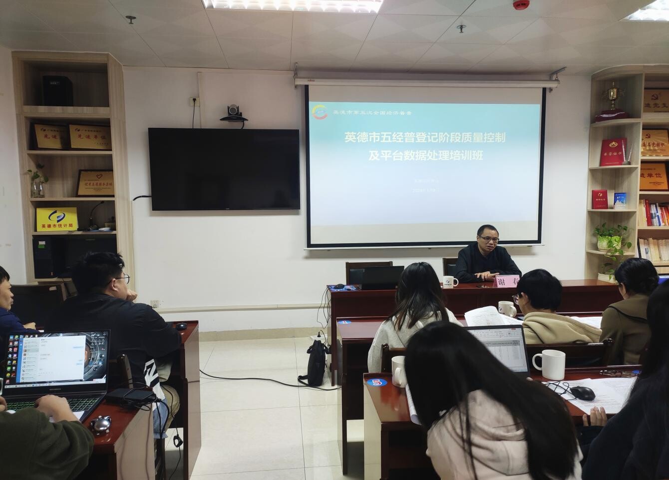 为全面扎实做好五经普普查入户登记工作,确保普查登记阶段工作高质量完成,1月8日,英德市经普办对24个镇街经普办业务骨干和数据处理员开展五经普数据质量控制及平台数据处理培训。英德市统计局副局长、经普办常务副主任谢春参加会议并讲话。