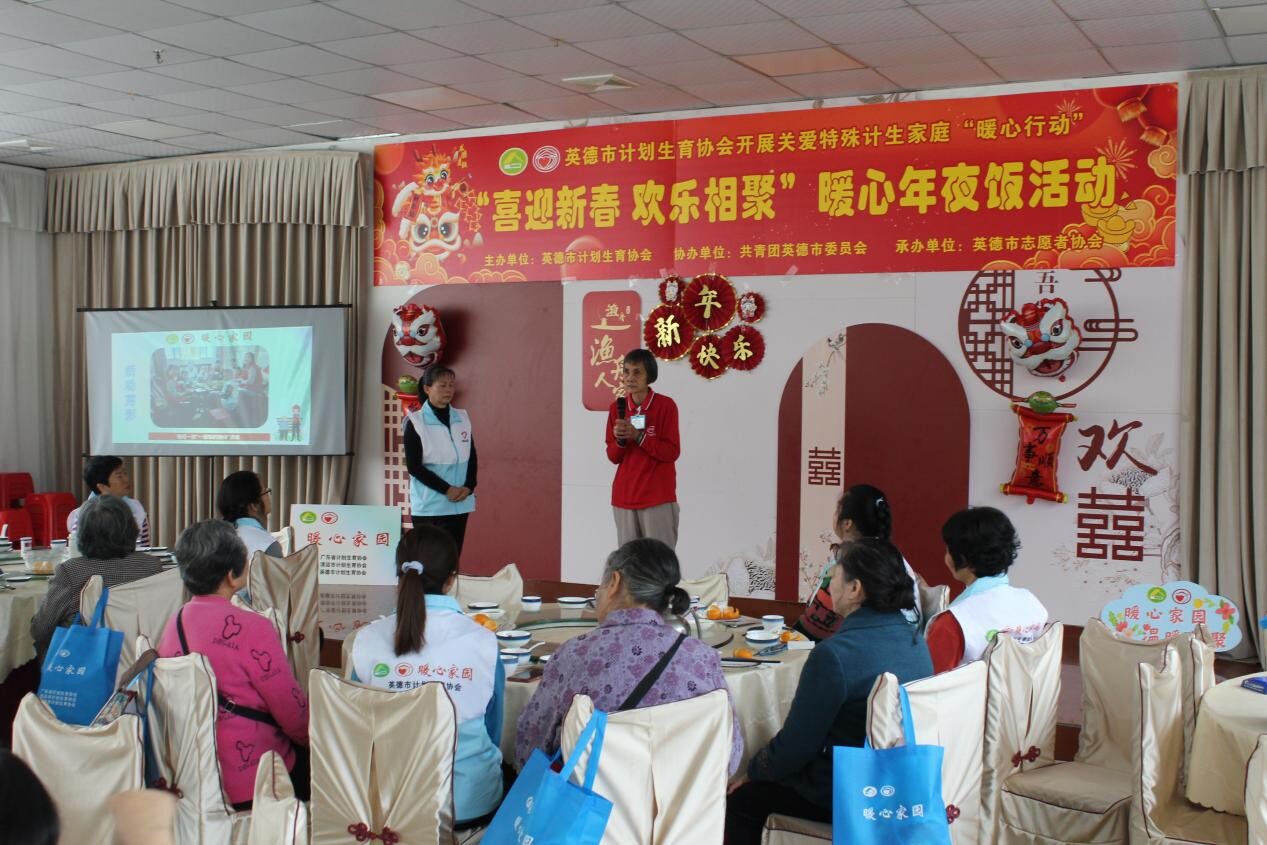 欢乐相聚”暖心年夜饭活动。英德市卫生健康局人口家庭发展与老龄健康股股长唐红霞、英德市计划生育协会秘书长袁小芬、共青团团英德市委志愿服务指导中心负责人黄玉玫等同志出席活动,20余名计生特殊家庭人员,10余名志愿者参加活动。