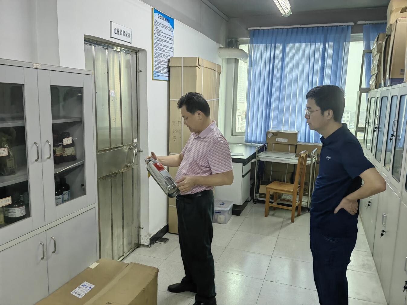 检查小组先后对消防器材的配置、危废贮存间内的危废物品、实验室场所及仪器设备等进行巡查,通过仔细查看与核对各贮存间的台账,了解各室仪器设备的用电安全和气密性安全。