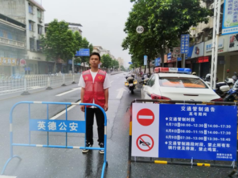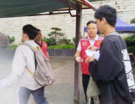 志愿者们在考点周边设立的高考服务岗站,协助考场校外的治安巡逻、交通疏导等工作,免费为考生提供饮用水、文具、口罩、防暑药品等物品,并为他们加油鼓劲、送上祝福。
