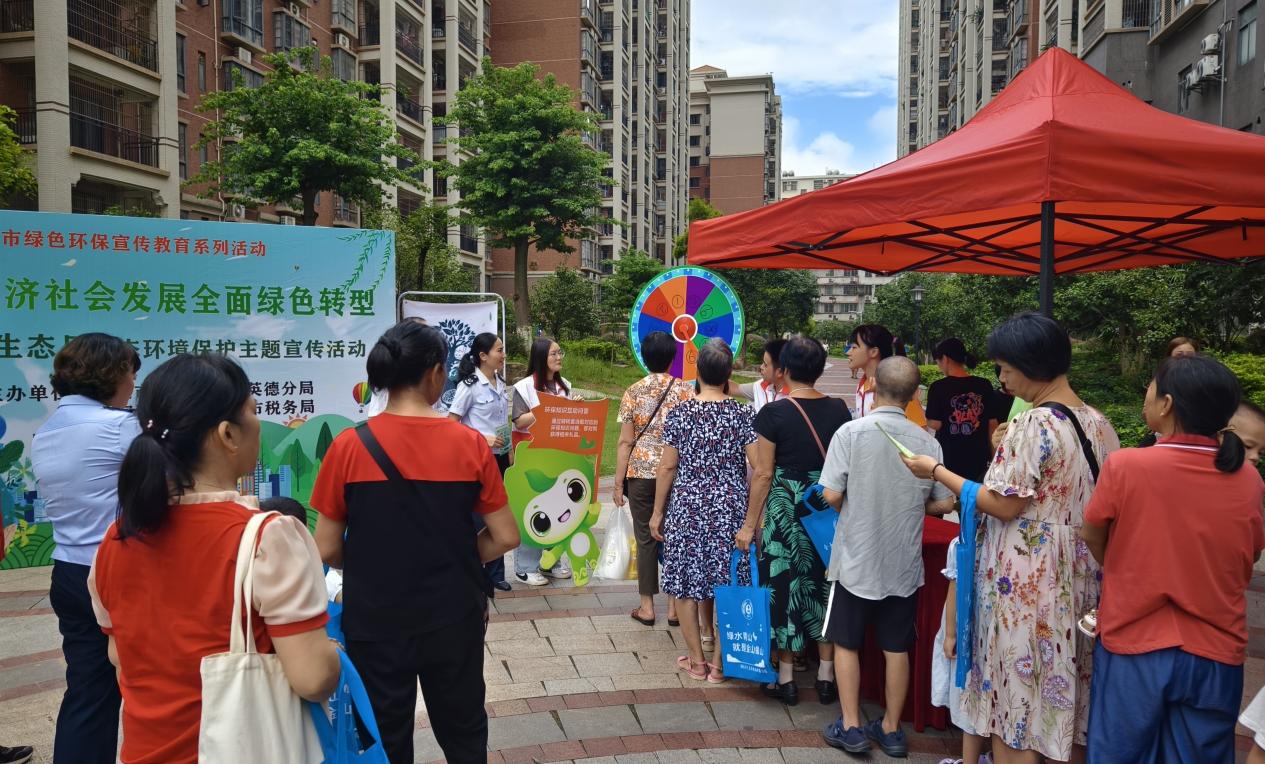 为深入宣传贯彻习近平生态文明思想,增强人民群众生态环境保护的思想自觉和行动自觉,2024年8月15日全国生态日当天,清远市生态环境局英德分局联合国家税务总局英德市税务局在鸿达花园小区开展以“加快经济社会发展全面绿色转型”为主题的宣传活动。