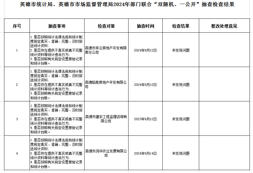 英德市统计局、英德市市场监督管理局2024年部门联合“双随机、一公开”抽查检查结果