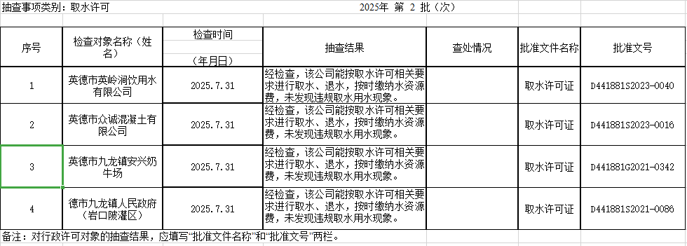 英德市英岭涧饮用水有限公司、英德市众诚混凝土有限公司、英德市九龙镇安兴奶牛场、英德市九龙镇人民政府(岩口陂灌区)“双随机、一公开”抽查检查结果表