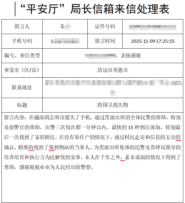 朱先生称本人在千里之外,素未谋面的情况下得到了帮助,感谢兢兢业业为人民付出的警察,对我局领导对民辅警的培养培育和英德公安为民解忧的执行力表示称赞,并通过局长信箱表扬信以感谢其对公安工作的肯定和赞扬。