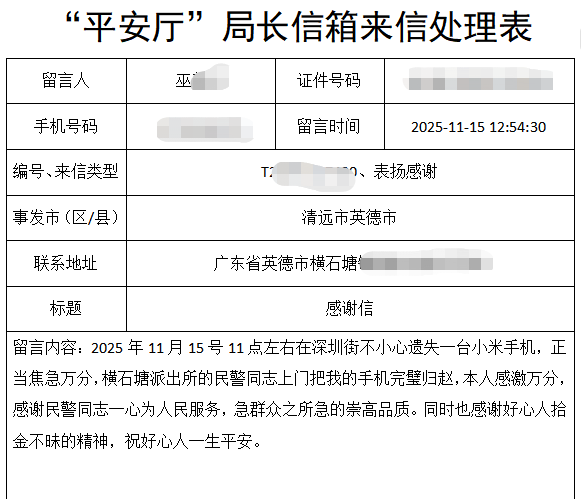 失主巫女士称正当自己焦急万分的时候,横石塘警务区的民警同志就把其手机完璧归赵,她感激万分。于是通过局长信箱表扬信来感谢民辅警同志一心为人民服务,急群众之所急的崇高品质,同时也感谢好心人拾金不昧的精神。下一步,我局将继续坚持以实际行动为群众办好事、办实事,不断提升人民群众获得感、幸福感和安全感。