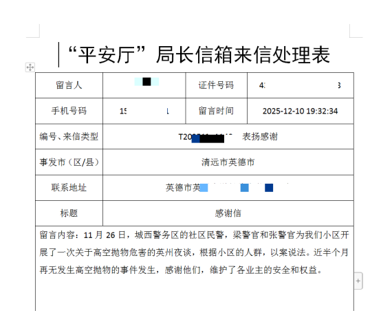 12月10日,我局城北派出所收到“平安厅”局长信箱转发江女士的表扬信。信中,江女士高度赞扬了英德市公安局城北派出所城西警务区民辅警对其小区开展高空抛物危害的普法教育宣传后,近半个月再无高空抛物的事件发生,其对派出所民辅警维护了各业主的安全和权益表示衷心感谢。