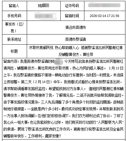 近日,英德市公安局黎溪派出所接到群众陆女士的求助,其称2月13日上午在安康路不慎被一辆电动自行撞倒,当时因慌乱未及时报警,现请求帮助调看事发路段监控以找到肇事方。接到该求助后,黎溪派出所高度重视,并由民警谢红清跟进。民警在了解陆某事件缘由后迅速行动,安排辅警黄俊杰、黄社带到事发点进行实地调查,最终成功查找到肇事方,核实人员信息无误后作出事故责任认定。后续,仅用半天的时间便帮助陆某和肇事方做好协商调解工作,在短时间内帮助群众解决问题。